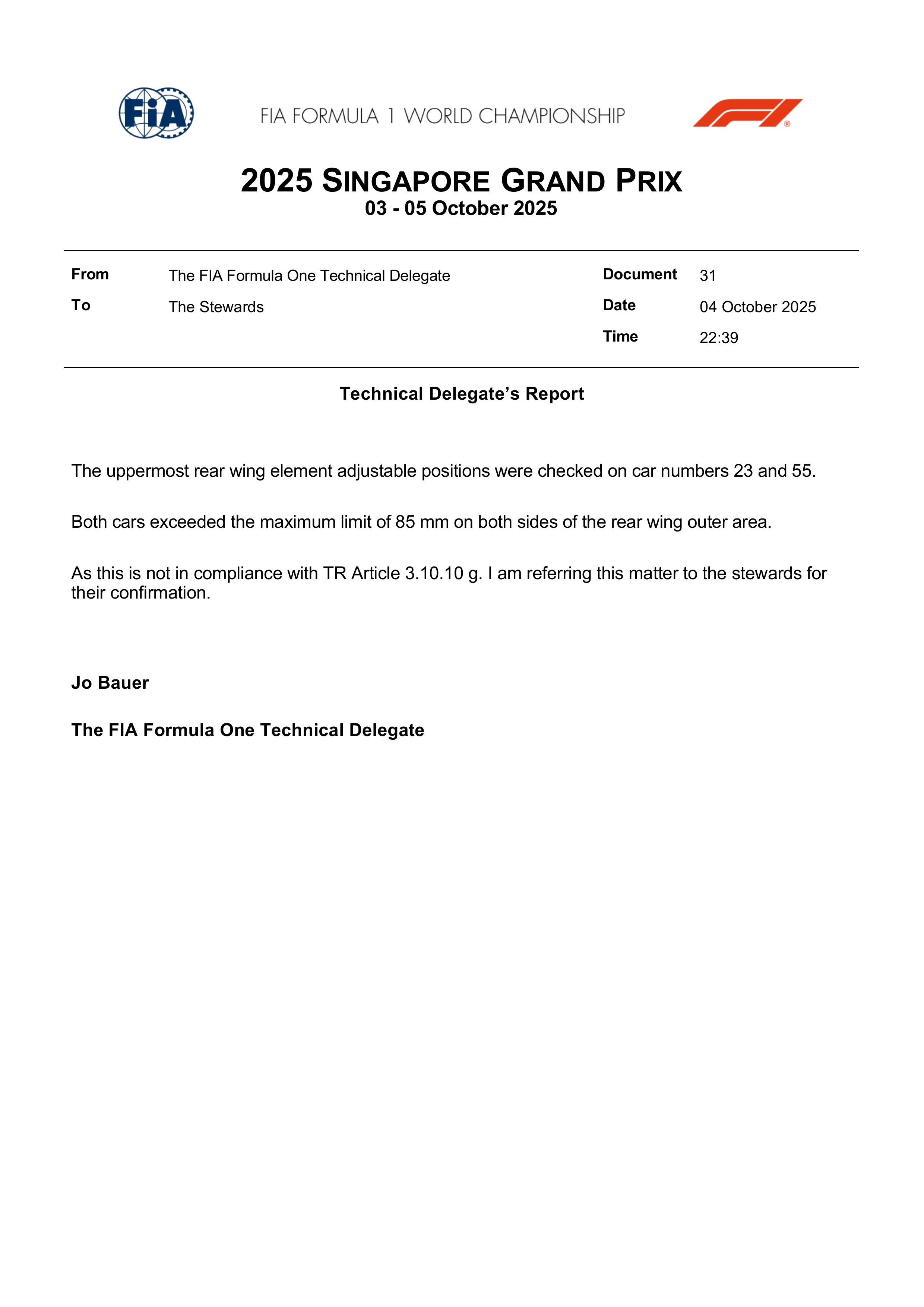 两台威廉姆斯赛车的尾翼翼片间隙均超标,大概率将会被取消排位赛成绩