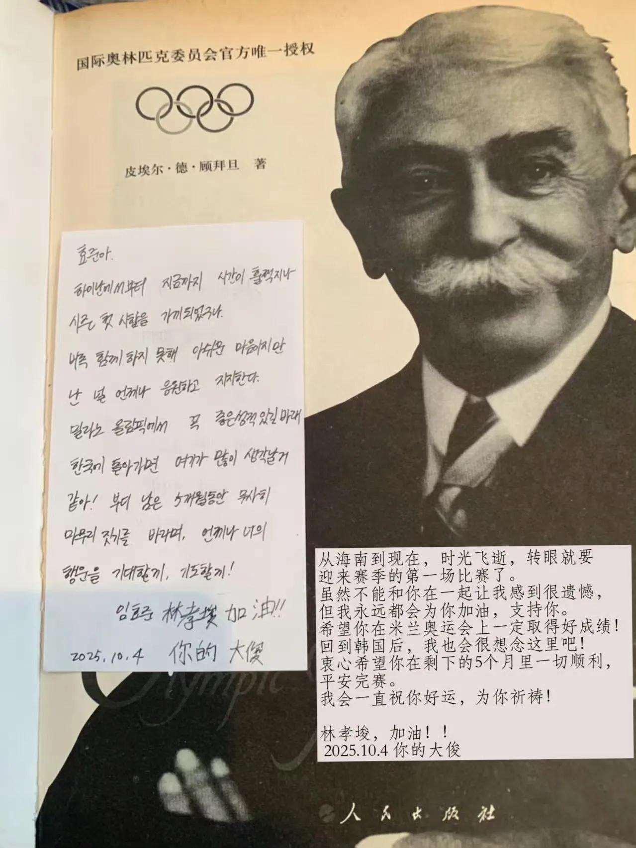 粉丝在北京铁手咖啡店看到了林孝埈的韩籍康复师柳在俊的留言,坐实了他已经离开的事实。 看着他的留言,想起年初亚冬会林孝埈夺冠后,掩面而泣的大俊,想必这段时间在他的职业生涯中也会是“奇妙”的一段时光。 大俊不能陪在小埈身边,但心是跟小埈在一起的,他也知道,为了奥运会,林孝埈经历了多少,坚持的是什么,有多么不容易,也知道林孝埈是意志非常坚定的,才会说:不是“我能做到”,而是“一定能做到”! 向前走吧,林孝埈,向着你的目标,你身后永远有更多人在支持你!