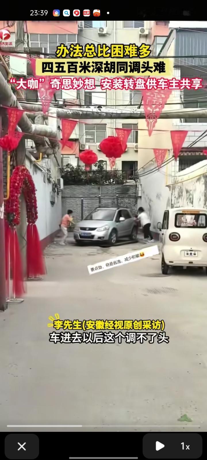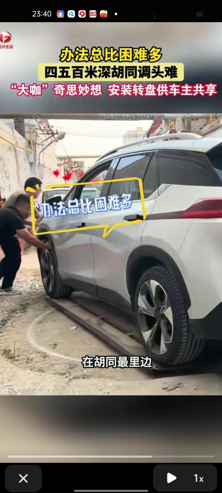 10月3日,石家庄新乐市。办法总比困难多,一辆车卡在四五百米深的胡同,只能倒出来。“大咖”奇思妙想,在胡同最里边下面弄一个转盘,供车主共享,直接开到那调头。