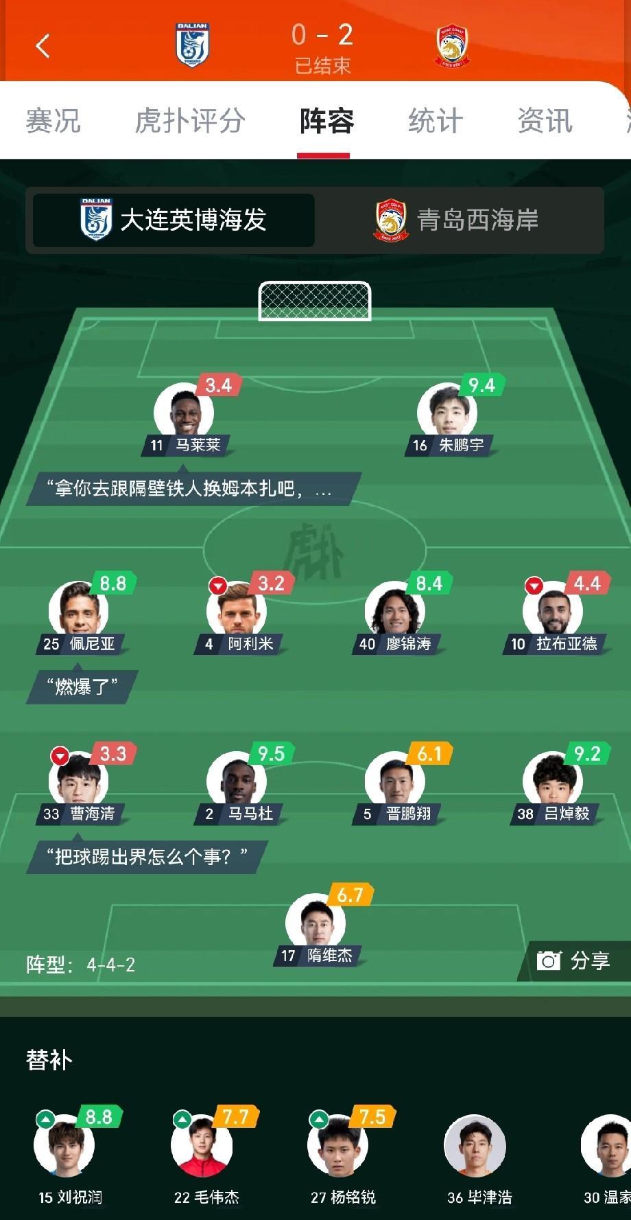 大连队怎么又在主场输球了,真是白瞎球迷氛围和北看台的精心准备! 梭鱼湾最差一场球,两个丢球都是自己失误造成的。 感觉目前大连队问题很多,前方前锋不能进球,后卫和门将又不稳当。把握机会能力太差了。 还有就这菜地,谁来不迷糊,这么好的观众和球场配了个格格不入的草坪。 看看明年大连队能不能把草坪换了,外援能换的话明年都换了吧,有些外援看着保级成功了就不出力了,太没有职业精神了。