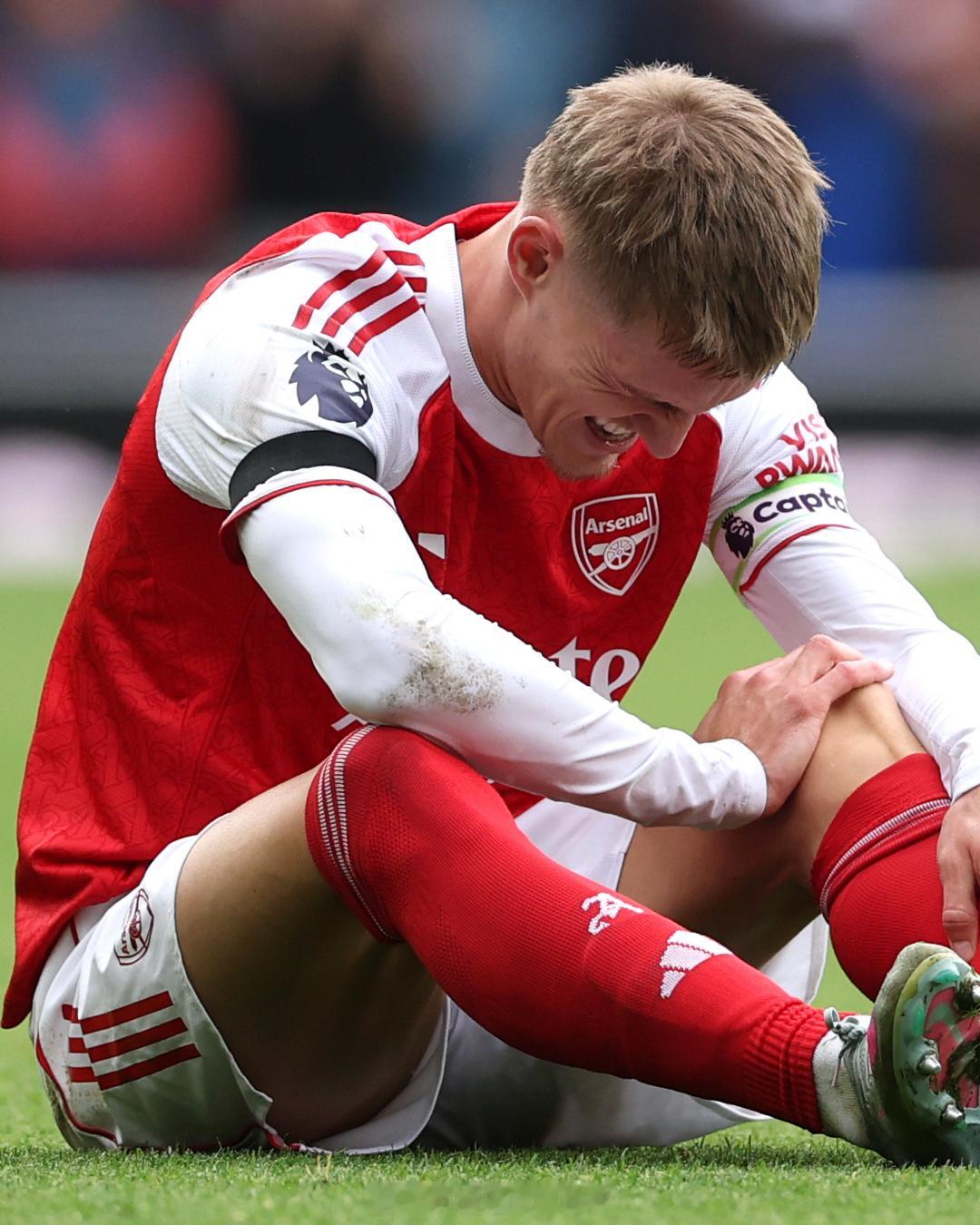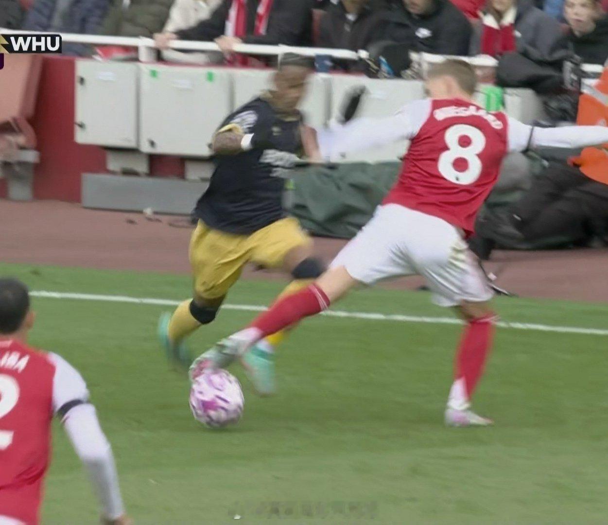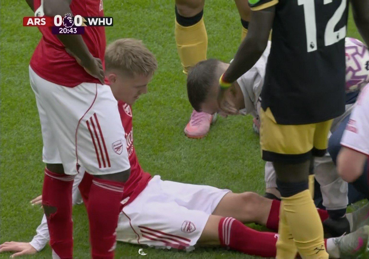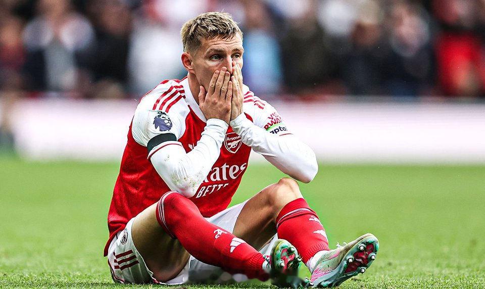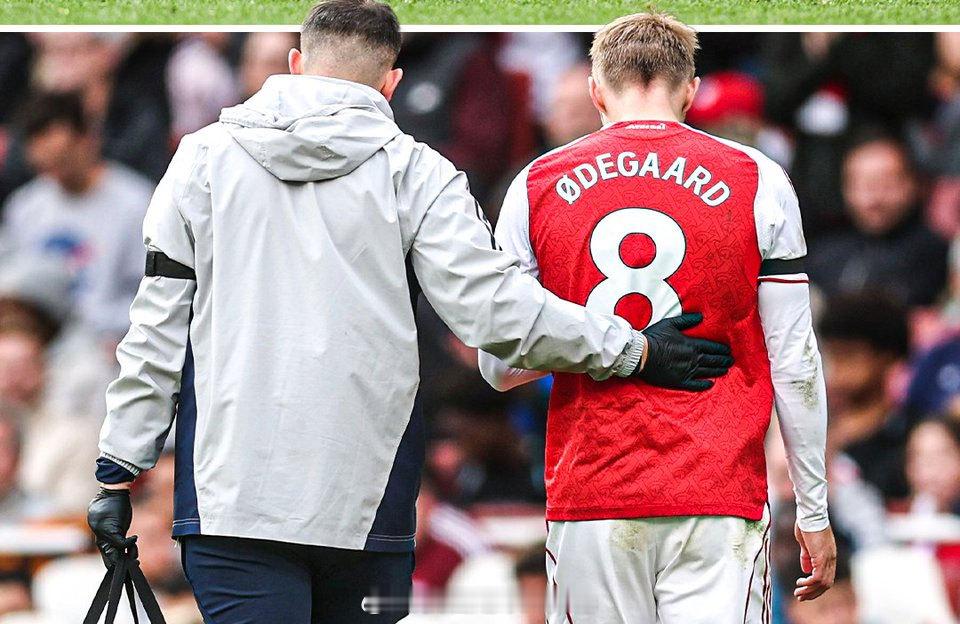 阿森纳队长厄德高,在一次身体对抗当中,被对方边锋萨默维尔撞到膝盖位置,受伤倒地!虽然之后重新投入比赛,但是最终无法坚持,被苏维门迪对位换下。