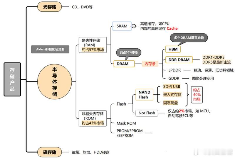 存储芯片是半导体行业中仅次于逻辑芯片的第二大细分领域。来源:网络总的来说,现在行业景气度回升,本质是从旧技术退场到新技术接棒过渡期,产能缩减但刚需不减,市场一边惜售一边担忧断供互相挤压,故而形成了这种供需失衡。这种供需失衡一开始只是结构性的,集中到了更直接地受益于AI大模型浪潮的DRAM身上,HBM作为AI芯片核心组件,价格涨幅最大。NANDFlash则在一定程度上拖累了上游厂商的业绩。正因如此,过去多个季度以来,上游厂商持续推行NAND产品减产策略。从芯片龙头业绩中也能看到趋势,美光科技披露了2025财年第四财季业绩中,DRAM产品同比增长69%,约占总营收的79%,而NAND产品收入却同比下降5%。但是,未来AI推理环节要落地到各种场景,比如智能客服、自动驾驶、图像识别,每天要处理海量的数据,这些数据得快速存、快速取,对存储的要求特别高:既要容量大,又要速度快,还得支持“随机I/O访问”。以前NAND的需求主要靠消费电子,比如手机、电脑的存储升级,但这些需求增长越来越平缓,甚至时不时因为下游疲软掉链子,如今AI给NAND带来了刚需级的新需求,这要比靠消费电子挤牙膏式增长强多了。但存储芯片的叙事变成了:一方面,AI带来的新需求在快速增长;另一方面,老的存储产品面临迭代淘汰,譬如企业级eSSD逐步向HDD渗透。行业供需关系到了转折点,不再是以前那种产能过剩、价格内卷的惨状。可以说,DRAM和NAND这两个方向都是半导体相对景气的黄金赛道,除了分销商和和模组厂商,国内芯片企业能否抓住这波机会?DRAM和NAND这两个领域,国内做的最好的分别是长鑫存储和长江存储,两家企业在全球市场各自占据约8%-10%的份额。长江存储是国产NANDFlash技术领导者,最显著的成就是成功研发并量产了232层3DNANDFlash,这一技术水平使其能够与三星、美光等国际巨头在主流市场上正面竞争。而长鑫存储是国产DRAM的领军企业,2019年成功量产8GbDDR4内存芯片,实现了国产DDR4芯片的首次突破。2023年推出LPDDR5系列产品,完成从DDR4到DDR5的技术跨越。今年7月份,长鑫科技拟IPO的消息振奋了资本圈。Counterpoint预测称,长鑫存储今年将在去年大幅增产的基础上产能进一步同比增长近50%,随着产能从DDR4/LPDDR4加速向DDR5/LPDDR5过渡,后者出货量份额将从一季度的1%左右分别提升到7%和9%。在NORFlash这一小众赛道,兆易创新的市场份额做到了全球第二,仅次于台湾华邦,7成收入来自存储芯片。而且鲜为人知的是,兆易创新还直接持有长鑫存储约1.88%的股权,前者的实际控制人、控股股东朱一明同时担任长鑫存储的董事长,两家企业在股权和业务上联系紧密。兆易创新的利基型DRAM产品由长鑫存储独家代工,2025年,双方预计的关联交易额将达到约11.61亿元。结构性缺货同样影响着利基型市场,2025年以来台股三大利基存储厂商旺宏、华邦电、南亚科合计营收大体呈现逐月攀升情况。随着AI数据中心需求增加以及车用市场逐步回暖,NOR Flash市场供需趋于健康,适时调涨报价成为必然趋势,NOR Flash价格在25Q4有望调升至双位数百分比,或有望延续至2026年。