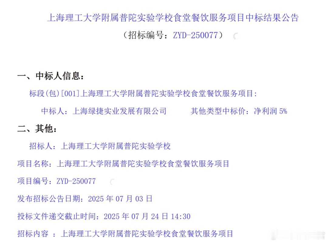 我再提一个合理怀疑的点,最近绿捷一直在频繁中标,比如类似上海市实验学校附属东滩学校发出的食堂委托管理项目的合同,中标人就是上海绿捷实业发展有限公司。不知道其他投标人中,有没有学生家长,有没有了解情况的,能不能举报一下是否有其他绿捷系的公司参与围标?就算绿捷的竞争对手没有举报围标,各个招标学校的采购负责人,是不是至少能看一下投标公司用的是不是同一个联系邮箱,是不是存在围标嫌疑?到时候情况如果反馈给采购中心、纪委、审计局、工商局,有关部门是不是就有理由来核查一下了?各个有关部门不会一个学生家长都没有吧?绿捷在这么风口浪尖的舆论压力下,还是能够连续中标上海理工大学和上海实验学校的食堂项目,实力这么强,必然是经得起查的吧?