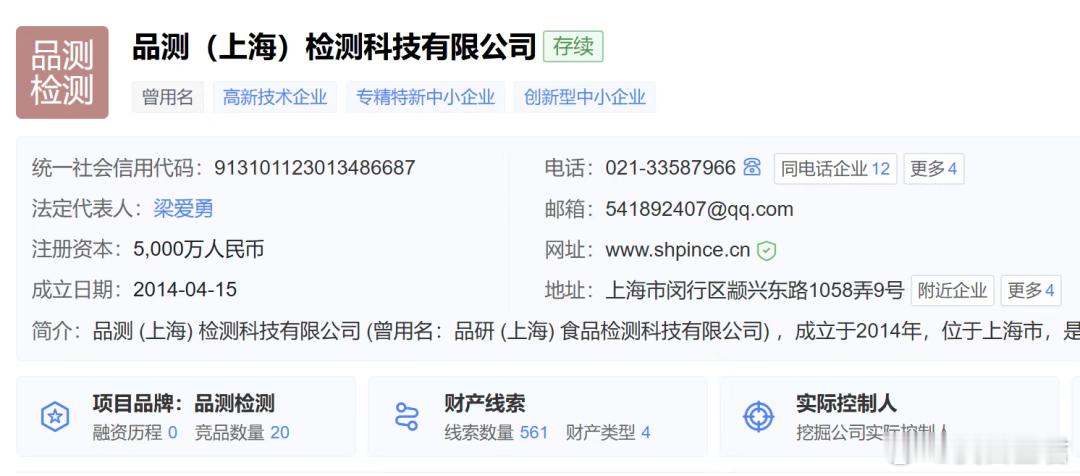 但是最不巧的,是下图这家公司的注册邮箱也是这个QQ邮箱;这家公司偏偏是做学校相关检测的,比如校服检测(关于校服检测,你可能关心的“小知识”-品测(上海)检测科技有限公司)、食品检测(品测助力市场局食安快检技能竞赛-品测(上海)检测科技有限公司)、政府检测(上海市市场监督管理局莅临品测(上海)检测科技考察指导-品测(上海)检测科技有限公司)。