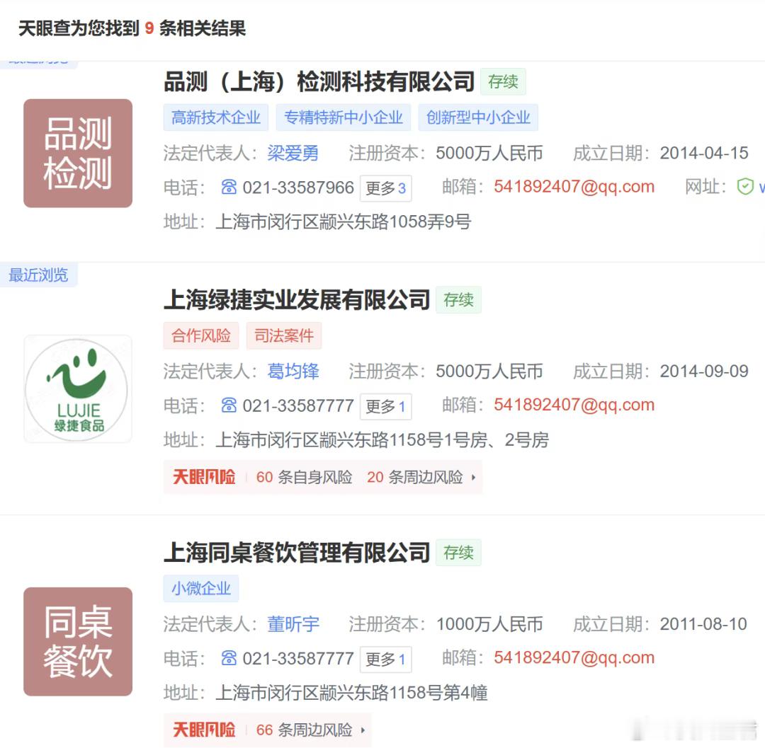 而现在上海饮料食品厂有限公司的法定代表人是黄旻;黄旻同时还是上海如悦餐饮管理有限公司的法定代表人、上海绿捷荟众餐饮管理有限公司的法定代表人。这几家公司恰好都是同一个联系邮箱;这几家公司恰好都是从事食品业务,而且这几个法定代表人恰好有同事关系、重合关系、前上下级关系。这也很合理对不对?毕竟大家可以都是餐饮行业的朋友。
