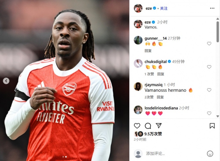 阿森纳登顶!埃泽社媒晒照庆祝胜利:加油