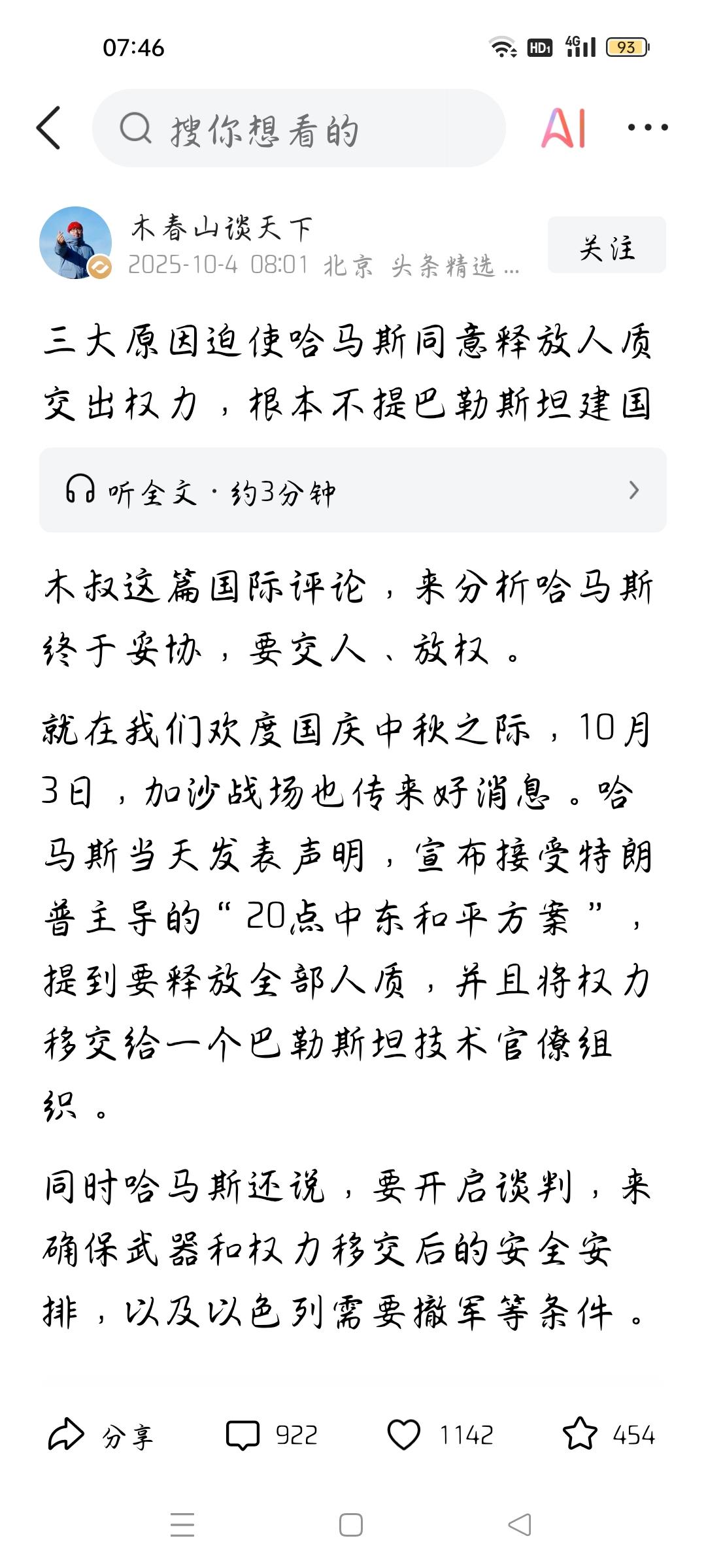 哈马斯为什么同意释放人质交权? 据木春山谈天下报道,10月3日,哈马斯宣布接受特朗普的“20点中东和平方案",释放全部人质,将权力移交给巴勒斯坦技术官僚组织,这里有一个问题,哈马斯为什么同意释放人质交权?个人认为,哈马斯也权衡利弊,继续打下去哈马斯面临全军覆灭,因为哈马斯的人力、财力、物力有限,相反以色列方要人有人,要装备有装备。而现在接受释放人质和交权,哈马斯剩下的人员有望获得自由和生命。我说得对吗?欢迎讨论。