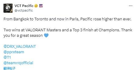 虎扑10月05日讯随着太平洋赛区最后一支代表队伍DRX止步2025全球冠军赛季军,太平洋赛区官推发文: