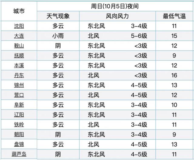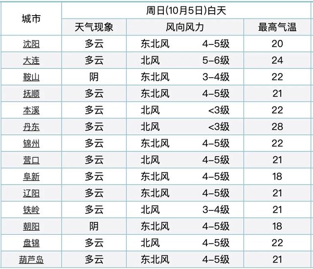 5日白天,全省多云。5日夜间到6日白天,大连、本溪、丹东、营口地区多云转阵雨或雷阵雨,其他地区多云。