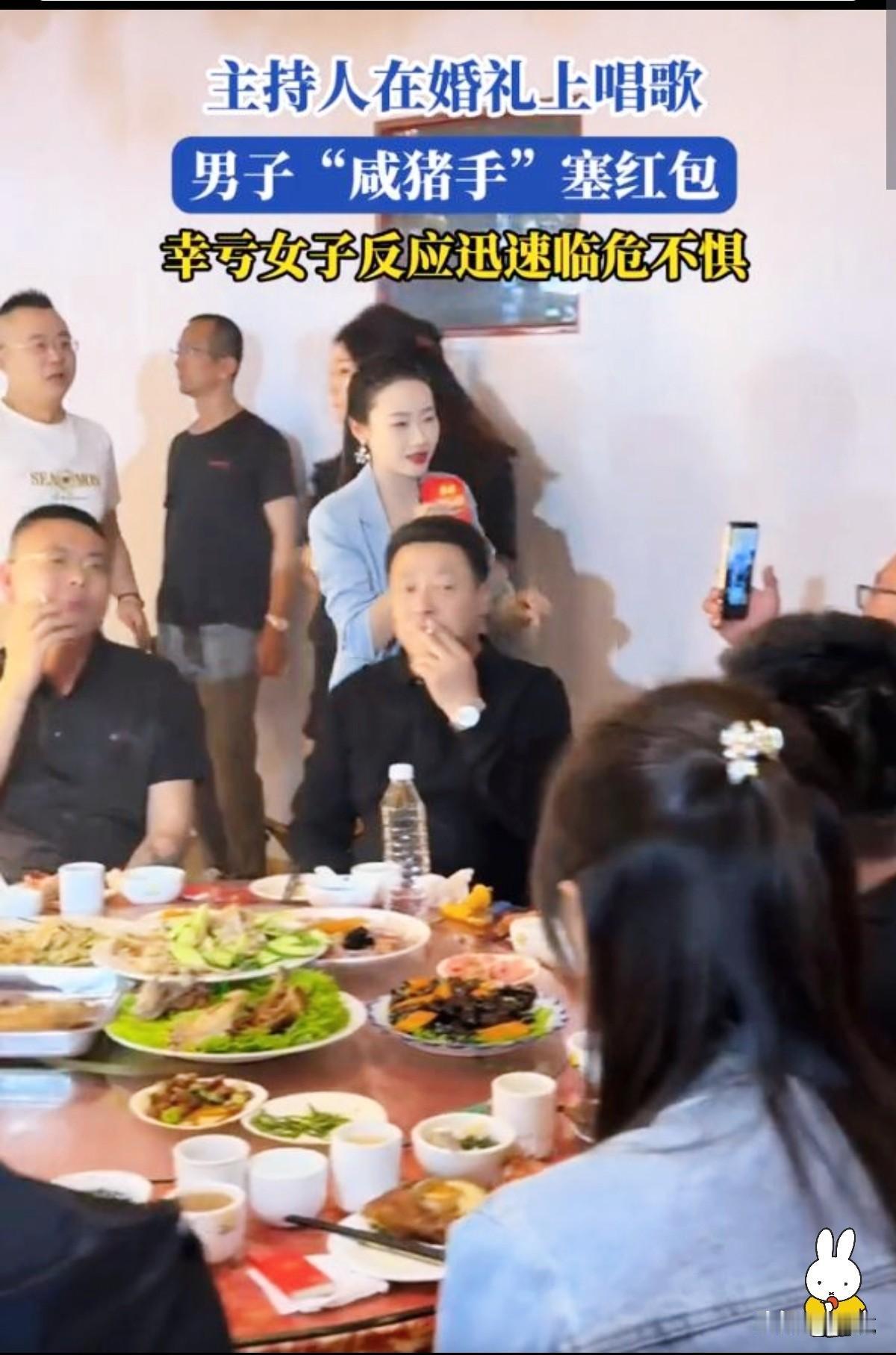 如果婚礼上突然有人从背后抱住你,还往你衣服里塞东西,你会怎么办? 山东一位婚庆女主持人就遇到了这样的惊心一幕。她正在台上深情献唱,一名男子突然靠近,伸手环抱,还把红包强行塞向她的胸前!全场宾客都惊呆了。 但女主持的反应堪称“教科书级别”:她瞬间侧身后仰,一只手精准架开对方胳膊,另一只手死死扣住男子手腕。整个动作行云流水,化解危机后,她居然还能若无其事地继续演唱,仿佛刚才什么都没发生。 这段视频火遍网络,网友们一眼看穿:“这男的动作太熟练了,绝对不是第一次!” 有人心疼主持人:“太专业了,要是我早就一巴掌扇过去了!”也有人愤愤不平:“凭什么要忍气吞声?这不就是在纵容骚扰吗?” 说实话,现在有些婚礼的“热闹”确实变了味。从之前某地伴娘被闹到崩溃大哭,到这次主持人遭骚扰,什么时候开始,喜庆变成了胡来的借口? 那位女主持人后来坦言:“我的任务是控场,不是砸场子。”这句话道尽了服务行业的心酸。但将心比心,谁愿意在工作时被这样“开玩笑”? 其实啊,真正的祝福从来都是带着尊重的。那些借着“闹喜”名义动手动脚的人,在别人眼里根本不是开心果,只会显得很掉价。 你在婚礼上见过哪些过分的“闹喜”行为?如果是你遇到类似情况,会怎么应对?欢迎在评论区分享你的看法