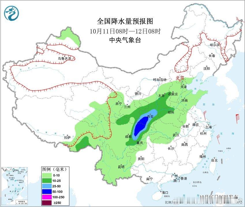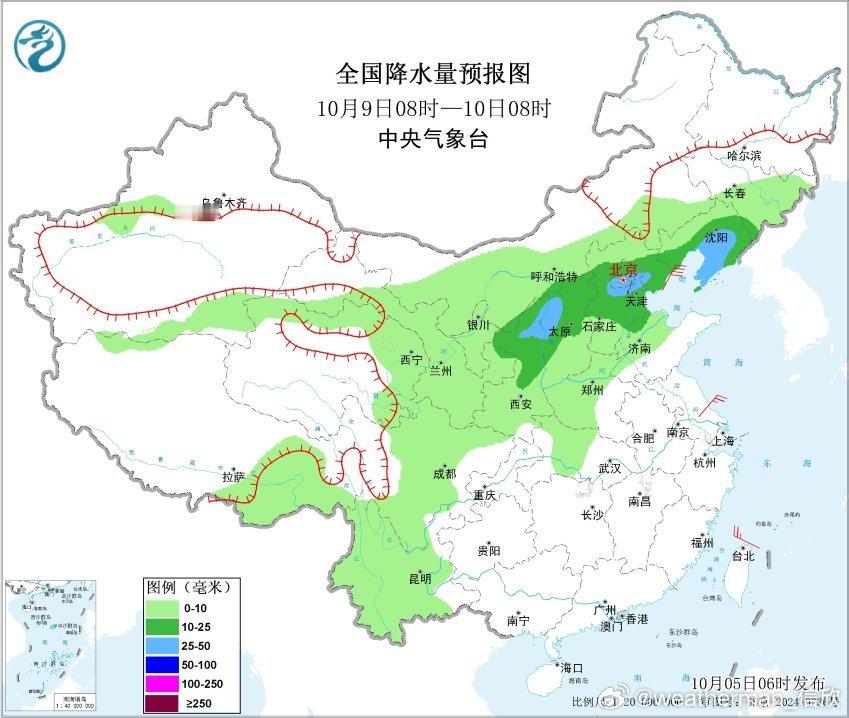 预计10月6日08时至7日08时,西北地区东部、华北中西部和南部、黄淮东部、四川盆地北部、西南地区南部、华南西部等地部分地区有中到大雨,其中,贵州西南部、云南东南部、广西西部等地部分地区有暴雨或大暴雨(100~180毫米)。