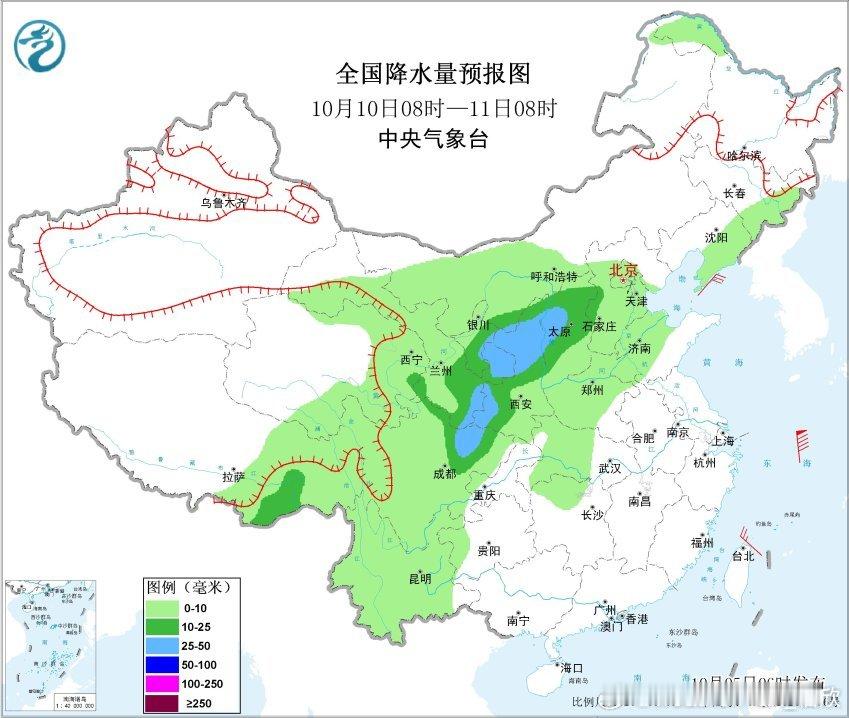 10月7日08时至8日08时,西北地区东部、华北中西部和北部、西南地区南部等地部分地区有中到大雨,其中,贵州西南部、云南中东部和西南部等地部分地区有暴雨或大暴雨(100~180毫米)。
