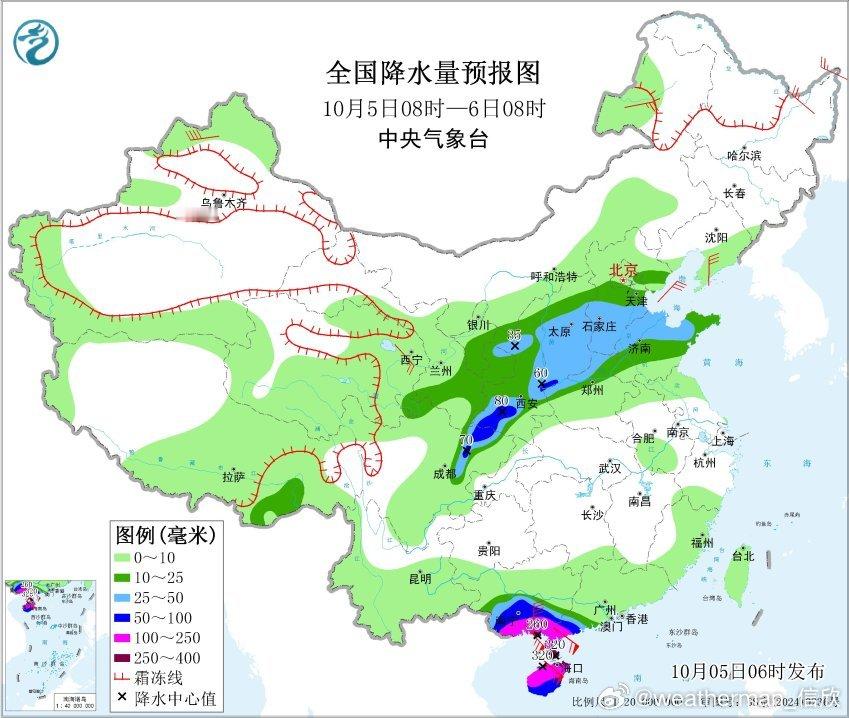 预计10月5日08时至6日08时,西北地区东部、华北中西部和南部、黄淮东部、四川盆地北部、华南南部和海南岛等地部分地区有大到暴雨,其中,广西南部、广东西南部、海南岛大部等地部分地区有大暴雨,广西东南部沿海、广东西南部沿海、海南岛北部等地局地特大暴雨(250~320毫米)。