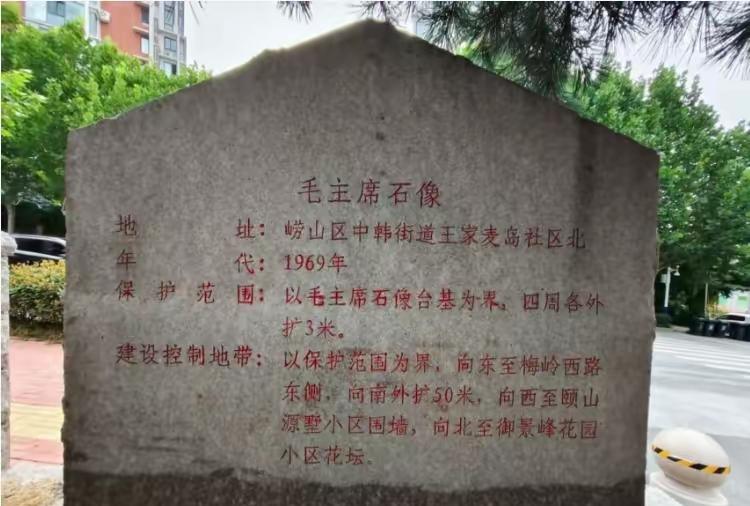 毛主席石像,在青岛崂山区某社区附近。 当年某房地产商出于经济利益,想予以拆除,咨询风水先生时,得出的结论是说不能拆,该房地产商当即就不敢造次了,在小区施工时还要施工队务必小心翼翼的,不能打扰老人家。 估计当时房地产商要是敢拆,风水先生不说话,也会被当地人出来阻挡的。该房地产商也算不错,没有被金钱迷住了心神,就敢冒天下之大不韪。 自从成为当地的保护文物之后,就更没人敢乱动了。