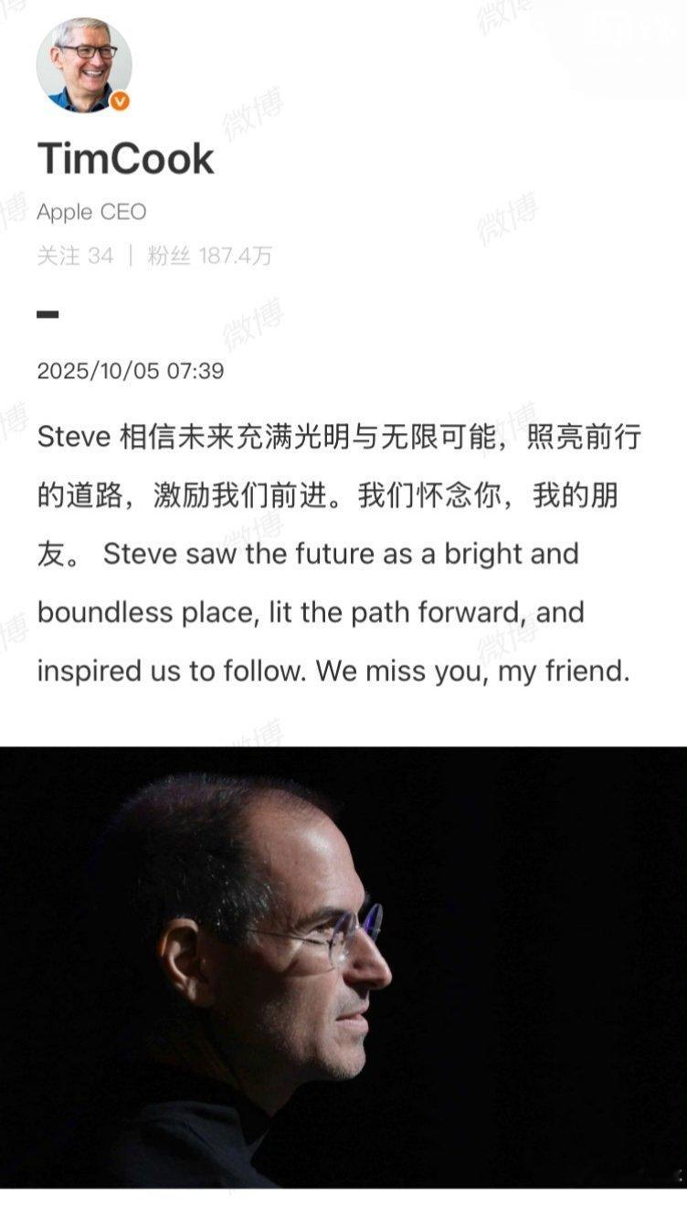 苹果现任 CEO 库克在微博发文,缅怀苹果公司联合创始人史蒂夫・乔布斯逝世 14 周年。