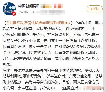 湖北武穴,城区某快递驿站报案称有三件快递被盗,其中数码相机售价三千多元。民警调取监控,发现一包裹严实的女子盗取多个快递,还用其中一个扫码离开避怀疑。经深入调查,该女子是惯犯,8月起就多次作案,民警锁定郭某,去其家搜出大量被盗物品,还发现其与丈夫诈骗的真相。 据新闻周刊报道,今年9月初的一天,突然,一个人大喊着要报案,说有3件快递不翼而飞,其中一台数码相机售价高达三千多元。 接到报案后,民警随后调取了驿站内的监控录像。在监控画面中,一个把自己裹得严严实实的女子引起了他们的注意。 这女子戴着帽子、口罩,只露出一双眼睛,鬼鬼祟祟地在快递堆里翻找着。只见她快速地拿起好几个快递,动作十分熟练,一看就是个老手。 更让人惊讶的是,最后她居然还拿其中一个快递扫码离开,想以此躲避怀疑。民警们看着监控画面,眉头紧锁,这女子的手法如此老练,肯定不是第一次作案。 民警们开始深入调查,他们沿着女子离开的路线,查看了周边的监控,不放过任何一个可能的线索。 经过一番艰苦的侦查,他们发现这女子居然是个惯犯,从8月开始,就多次在快递驿站用类似手法偷东西。 原来,这女子郭某发现快递丢了能向平台申请全额退款后,就和丈夫胡某打起了坏主意。 胡某负责在快递丢失后向平台申请退款,而郭某则负责去偷快递。他们以为这样就能神不知鬼不觉地赚钱,却没想到这么快被发现了。 随着调查的深入,民警们掌握了越来越多的证据。他们通过仔细的视频侦查,终于锁定了犯罪嫌疑人郭某。民警们决定对郭某进行抓捕,他们来到了郭某的住处。 当民警们冲进郭某的家时,眼前的景象让他们大吃一惊。 屋里堆满了各种各样的被盗物品,有衣服、鞋子、电子产品,还有之前丢失的那台数码相机。经过清点,这些被盗物品的价值相当可观。 更让民警们意外的是,他们发现那些高价值快递的收件人居然都是郭某。原来,郭某每次偷完快递后,都会让丈夫胡某以收件人的身份向平台申请退款,自导自演搞起了诈骗。 民警们迅速将郭某和胡某控制住,并带回了派出所进行审讯。在审讯室里,郭某和胡某一开始还百般抵赖,但在铁一般的证据面前,他们最终不得不承认了自己的犯罪事实。 原来,郭某和胡某生活并不富裕,看到别人买新东西就心生嫉妒。当郭某发现快递丢失可以退款这个漏洞后,两人便一拍即合,开始实施他们的盗窃和诈骗计划。他们以为自己做得天衣无缝,却没想到最终还是被识破了。 那么,郭某多次盗窃快递的行为,会受到什么样的处罚? 依据刑法规定,盗窃罪是指以非法占有为目的,盗窃公私财物数额较大或者多次盗窃、入户盗窃、携带凶器盗窃、扒窃的行为。 郭某具有非法占有快递内财物的故意。她发现快递丢失能申请退款后,便产生通过盗窃获取财物并利用退款漏洞获利的目的。 郭某实施了秘密窃取的行为。她把自己裹得严严实实,在快递驿站里快速拿起好几个快递,动作熟练,且从8月起多次作案,符合多次盗窃的特征。 郭某的行为侵犯了快递所有者对财物的所有权。快递虽暂存于驿站,但所有权仍属于收件人,郭某的盗窃行为破坏了这种合法的财产占有关系。 郭某和胡某以收件人身份向平台申请退款的行为,会受到什么样的处罚? 诈骗罪是指以非法占有为目的,用虚构事实或者隐瞒真相的方法,骗取数额较大的公私财物的行为。 郭某和胡某具有非法占有平台退款的目的。他们生活不富裕,心生嫉妒后,发现快递丢失退款漏洞,便一拍即合,企图通过这种不正当手段获取钱财。 二人实施了虚构事实、隐瞒真相的行为。郭某盗窃快递后,胡某以收件人身份向平台申请退款,隐瞒了快递是被盗窃而非正常丢失的事实,使平台基于错误认识而交付退款。 他们的行为侵犯了平台的财产所有权,平台因他们的欺骗行为遭受了财产损失。 最后,郭某和胡某会面临怎样的处罚? 对于郭某的盗窃罪,由于她多次盗窃,依据《刑法》的规定,多次盗窃的,处三年以下有期徒刑、拘役或者管制,并处或者单处罚金。具体量刑会考虑盗窃财物的总价值、盗窃次数、手段等因素。若被盗物品价值较高,可能会接近三年有期徒刑,并处较高数额罚金;若价值相对较低,可能会判处拘役或者管制,并处一定数额罚金。 对于郭某和胡某的诈骗罪,若诈骗数额较大,依据刑法规定,处三年以下有期徒刑、拘役或者管制,并处或者单处罚金;数额巨大或者有其他严重情节的,处三年以上十年以下有期徒刑,并处罚金;数额特别巨大或者有其他特别严重情节的,处十年以上有期徒刑或者无期徒刑,并处罚金或者没收财产。 具体量刑需根据诈骗数额来确定,若诈骗数额达到数额较大标准,可能会被判处三年以下有期徒刑等刑罚。 最终,郭某和胡某可能会因盗窃罪和诈骗罪数罪并罚,面临更严厉的刑罚。 目前,郭某和胡某已被警方刑事拘留,案件还在进一步侦办中。