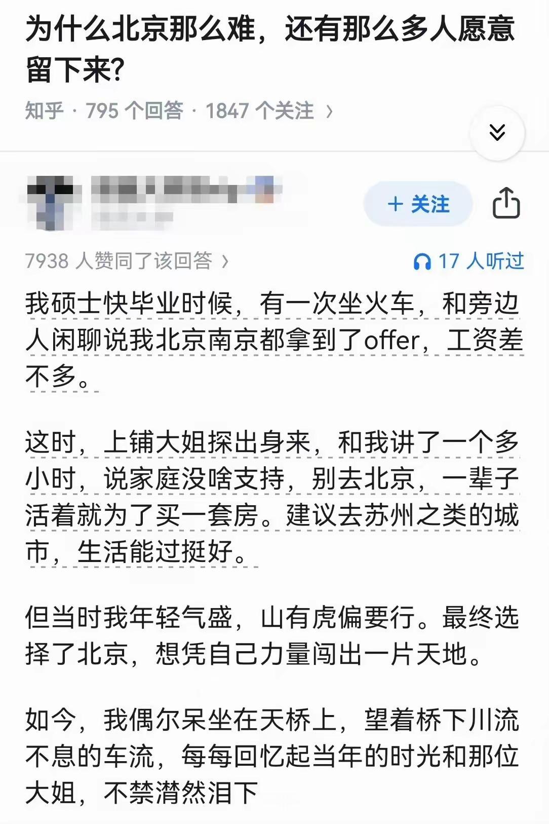 北京确实压力太大了! 网友评论: 不是百里挑一的优秀人才确实不适合来北京,因为卷不动。即使有家里支持,自己能力不足也只会导致整体大出血,拖垮父母 去过的一线城市就数北京最一言难尽,要吃没吃要喝没喝,街道上地铁里的人大多沉默的要死,道路拥挤过街天桥走到无语,去个天安门还要提前预约,机场地铁公交工作人员的工作服像是穿了好几年了……… 来北京混个简单的生活可以,一定不要有什么梦想,