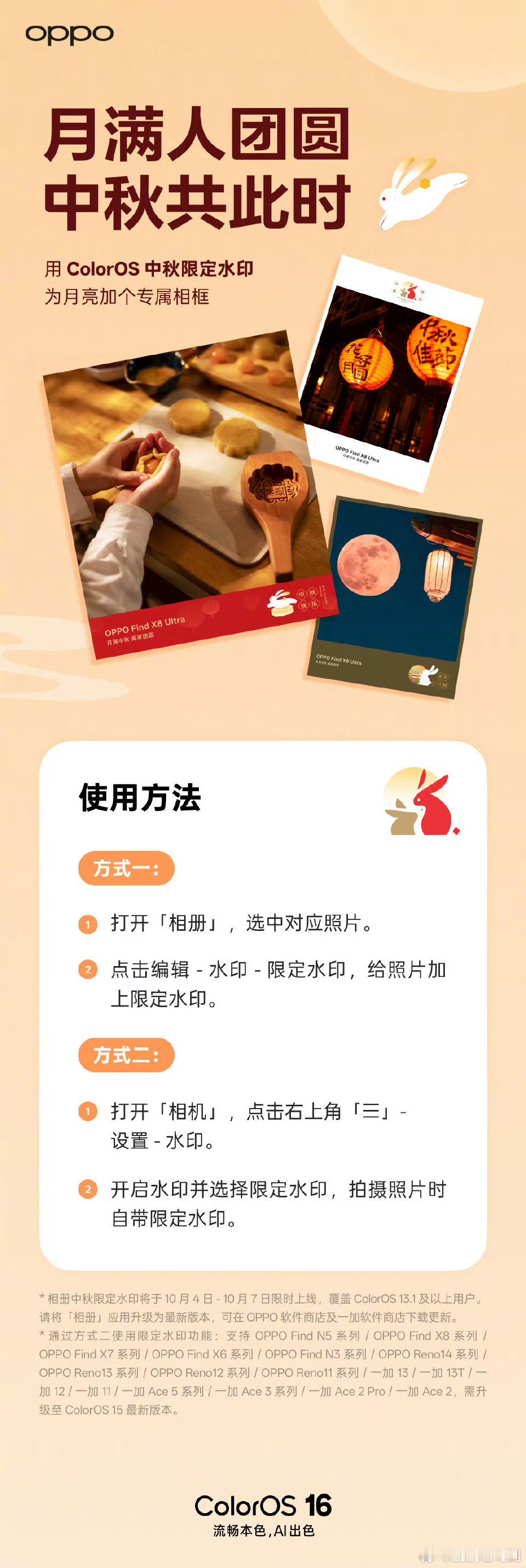 OPPO 手机 ColorOS 中秋水印限时上线。加上专属中秋水印,大家赶快试试![笑而不语][笑而不语]