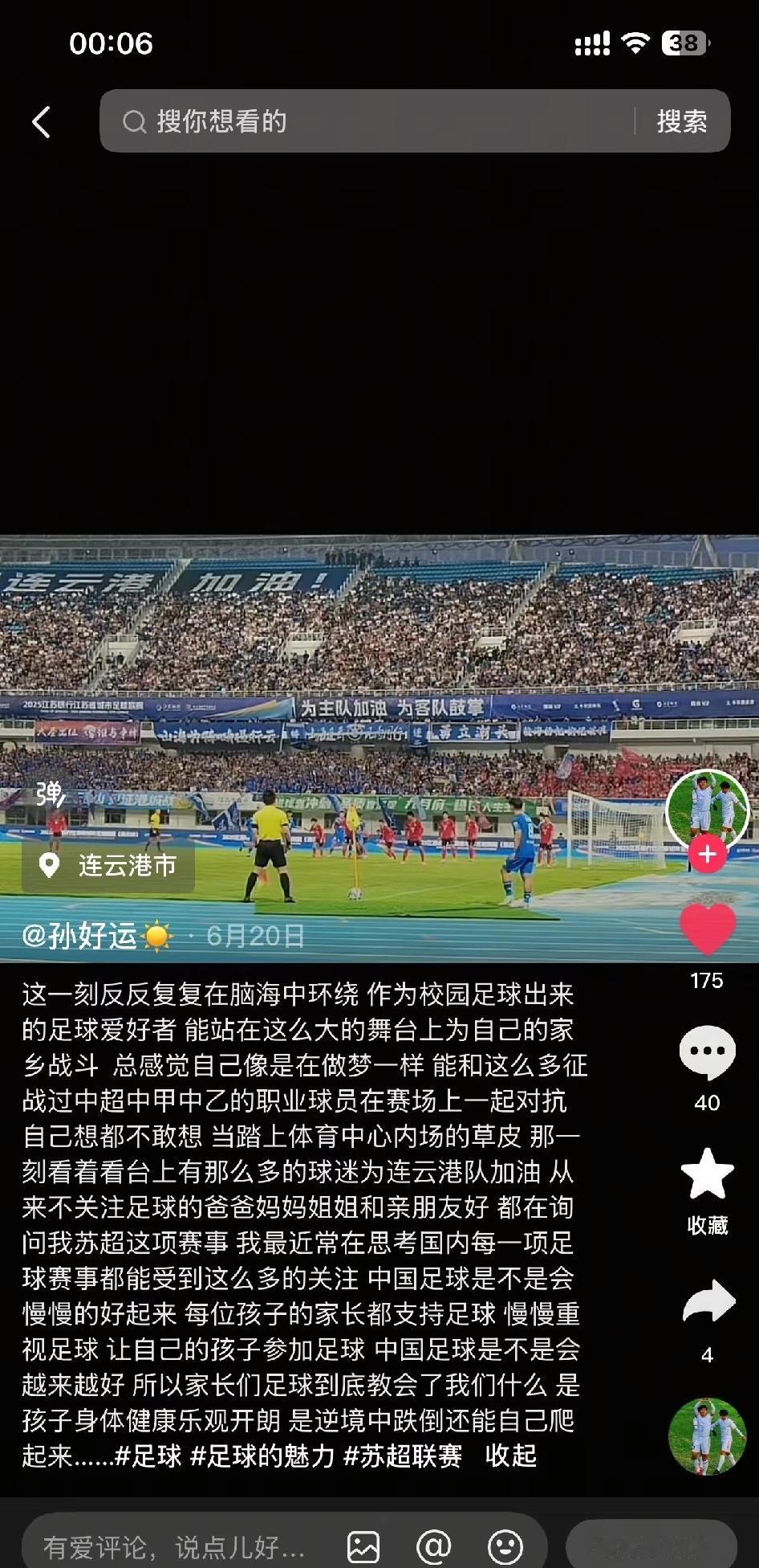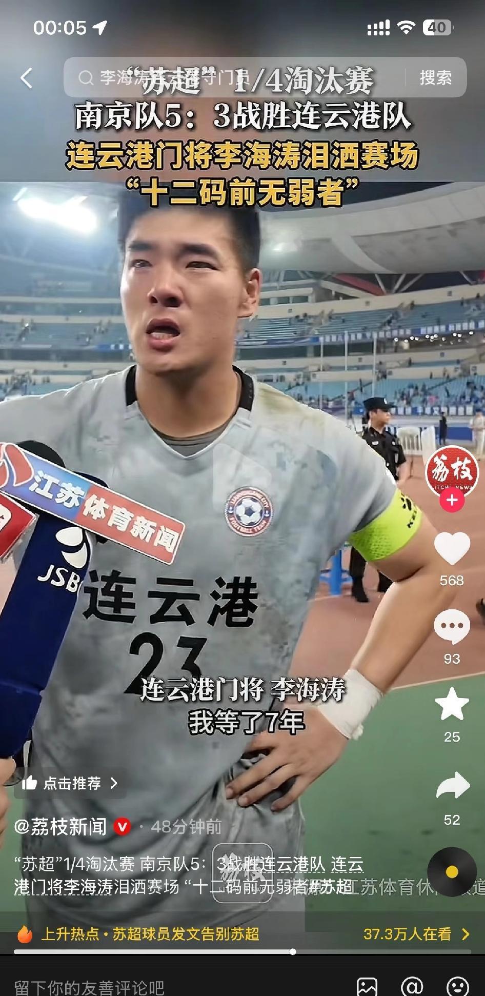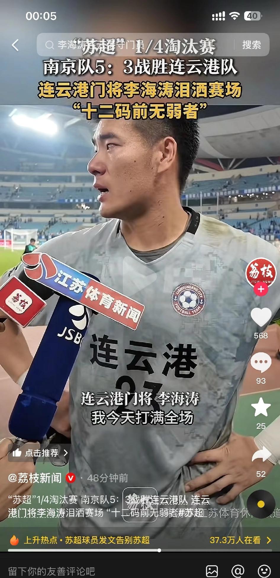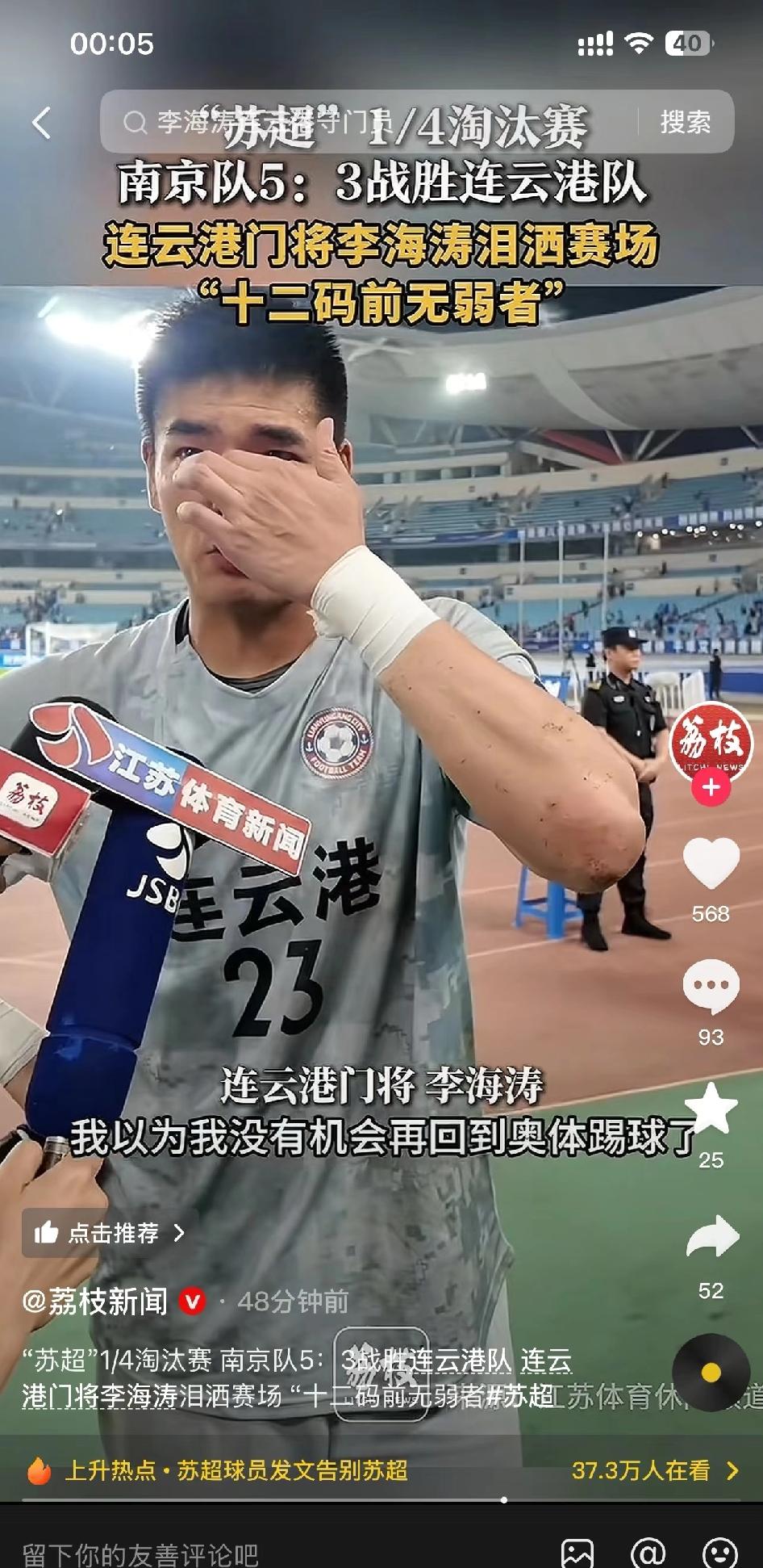 怎能不爱苏超啊! 阿连的门将很棒,我昨天一直在给阿连加油,后来裁判去看视频研究判罚时,我一直在说给阿连一个点球吧,结果真的判了个点球,虽然最后还是南京赢了,但是这场比赛很精彩。