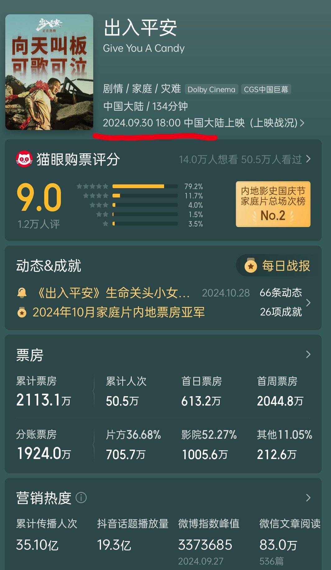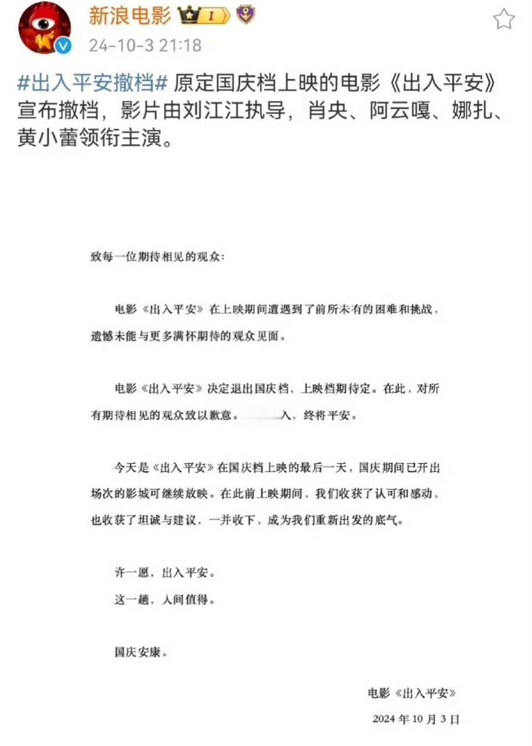 我想起来肖央的《出入平安》去年也是硬闯国庆档,撤档之后就再也没上过