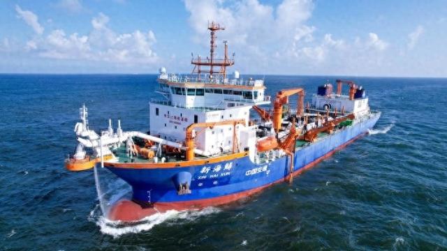 “新海鲟”轮是国内领先、国际一流的新型智能疏浚船舶,是全球最大的LNG双燃料耙吸挖泥船,仅需一个半小时的疏浚量,就能够将一个标准的足球场垫高2米多,堪称“深海金刚”。