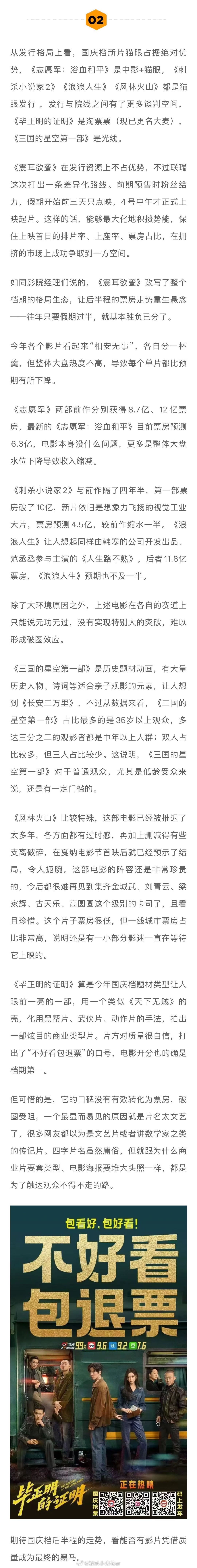 国庆档最大的新鲜感是新面孔 主旋律大片始终是国庆档的主流 今年国庆档整体大盘热度不高,导致每个单片都比预期有所下降。《志愿军:浴血和平》《刺杀小说家2》的票房均不及前作,《浪浪人生》预期也不及一半。除大环境原因之外,上述电影在各自的赛道上只能说无功无过,没有实现特别大的突破,难以形成破圈效应…娱理独家↓