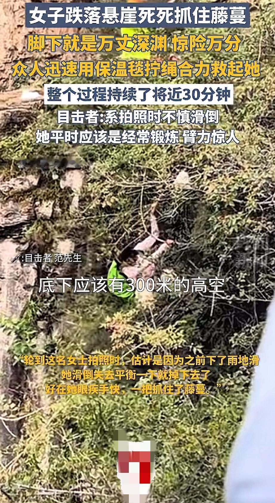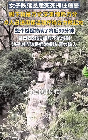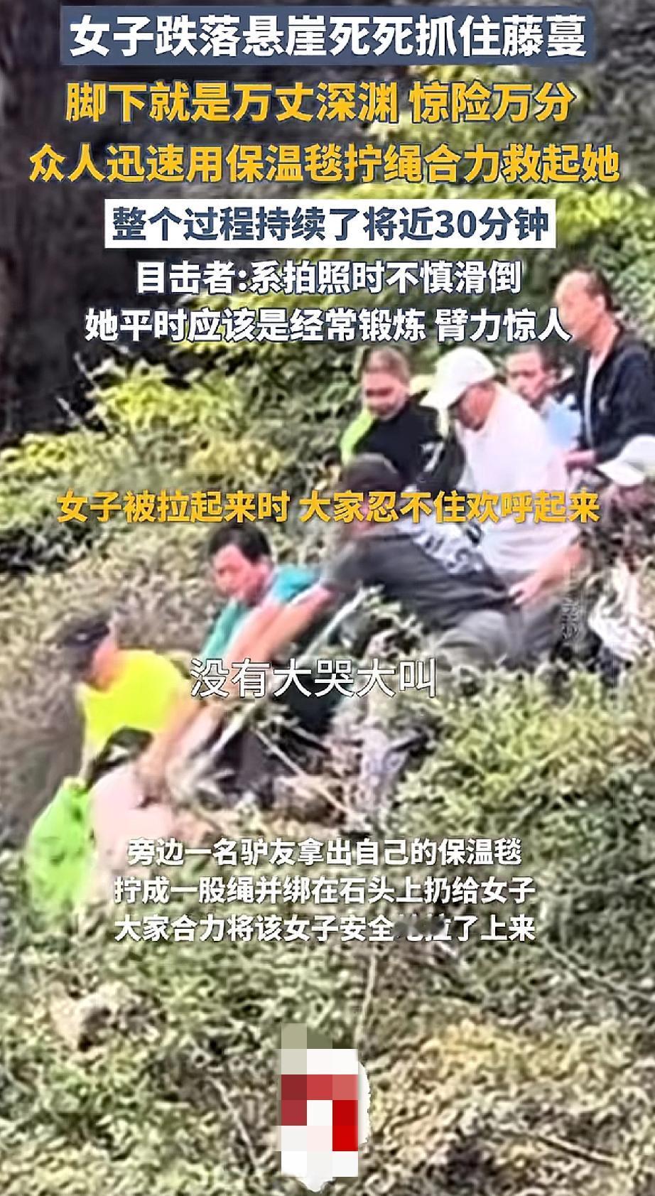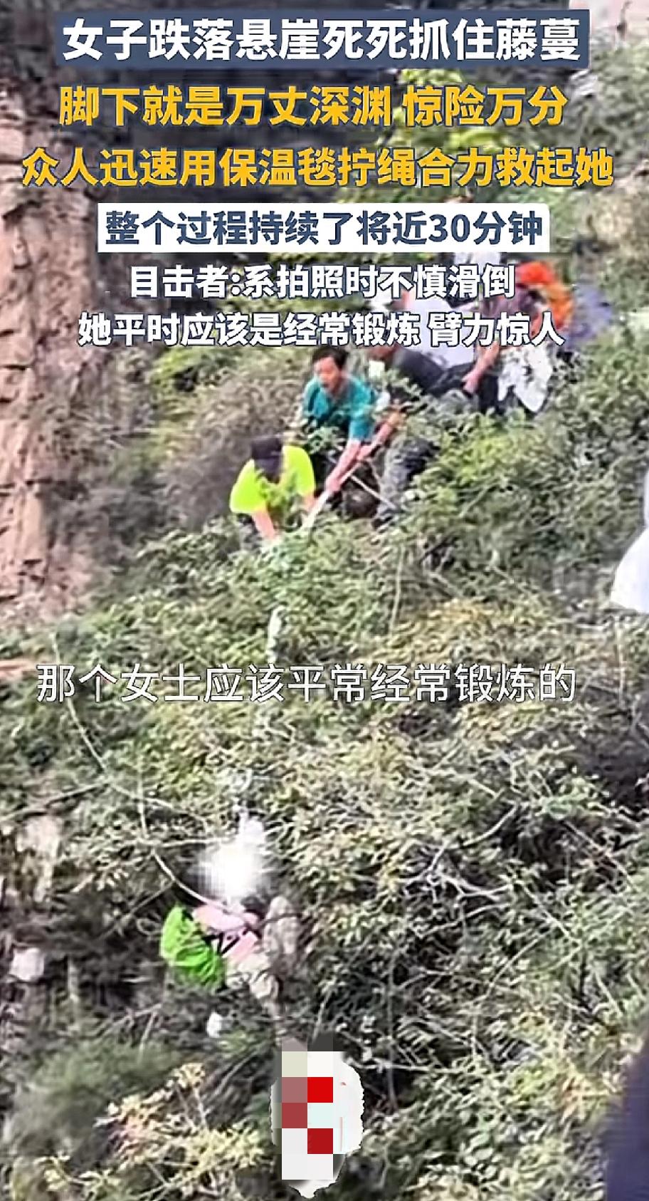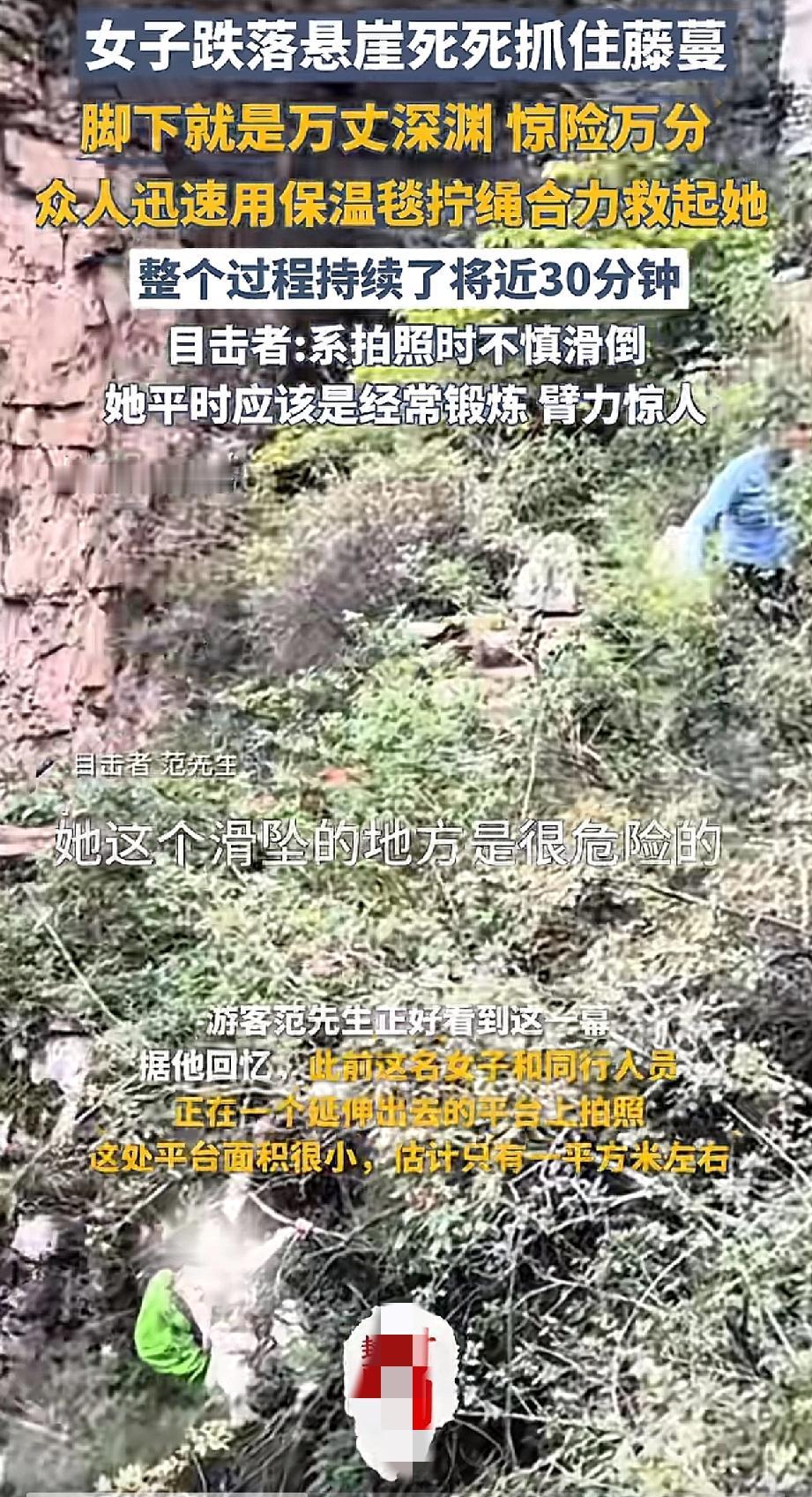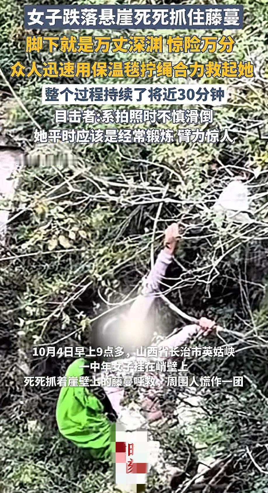 “万万没想到啊!”一中年女子在山西长治瑛姑峡拍照。在悬崖边,同伴拍完照轮到她时,由于之前下过雨地面滑,没站好打滑,突然失去平衡掉下来了。还好她眼疾手快一把抓住了旁边的藤蔓。万万没想到的是她臂力很好,抓了30多分钟,而且她的心理素质也很好,没有大哭大叫。 不得不说这个中年女子真的太幸运了!因为她是和同伴一起出游的,景区来来往往的游客也很多。大家拿出随身带的保暖毯子,拧成一股绳。同伴和游客们合力将女子从悬崖边上救了回来。目击者范先生说,她的臂力惊人,她平时一定很喜欢运动。 网友热议, 事实证明:爱锻炼的人,在爬山遇到危险时候可以凭借体力救自己,而不爱锻炼的人,不会去爬山。 诸多因素结合在一起,女子如此幸运。她和同伴们来到景区,首先人很多;其次,她冷静处理抓住藤蔓,没有大嚷大叫,保存体力。这跟他平时爱运动是分不开的。 对此大家怎么看?
