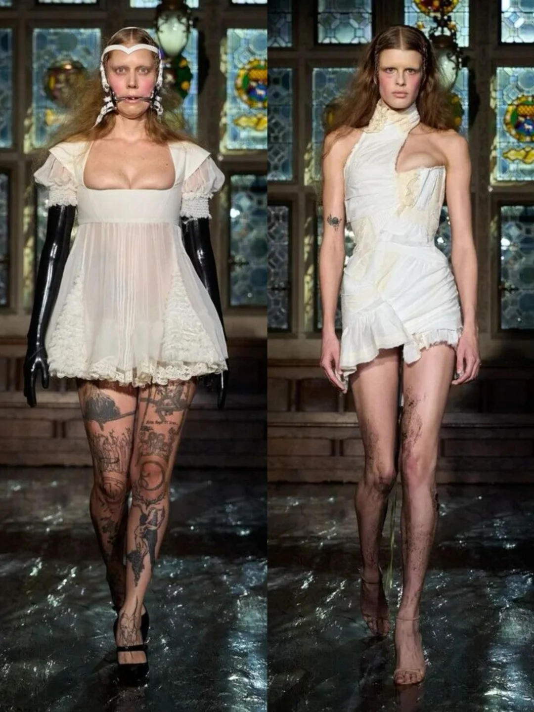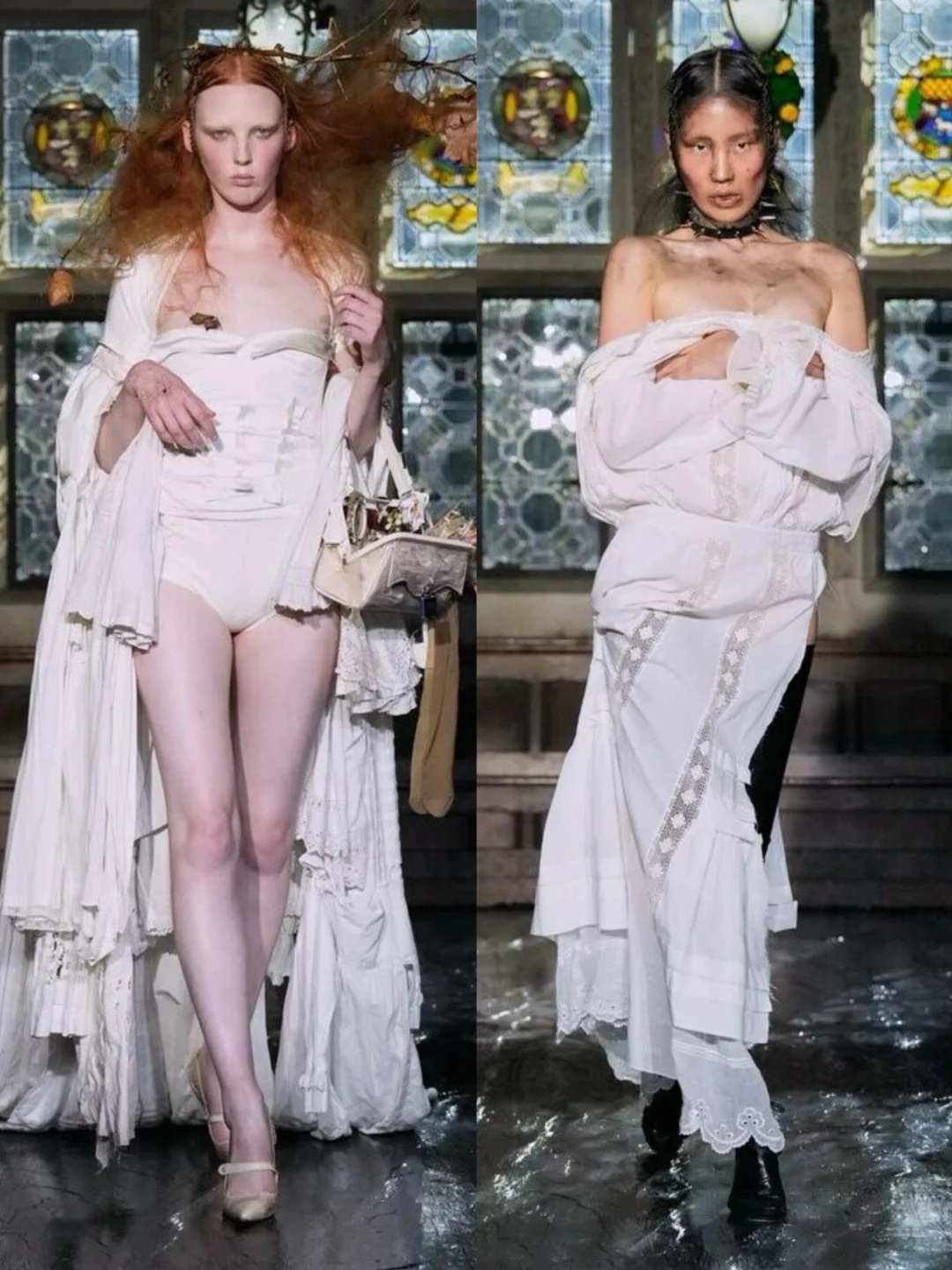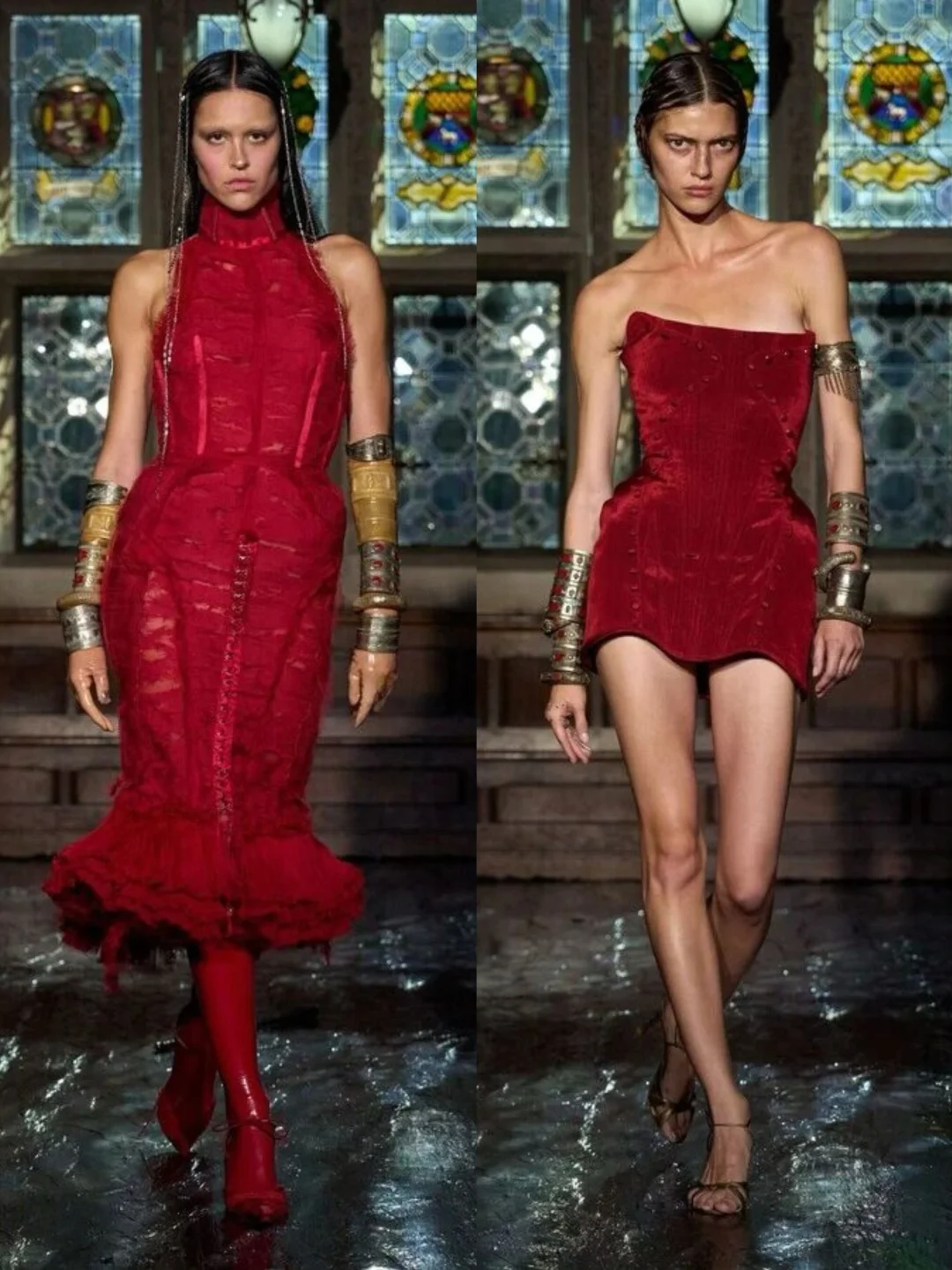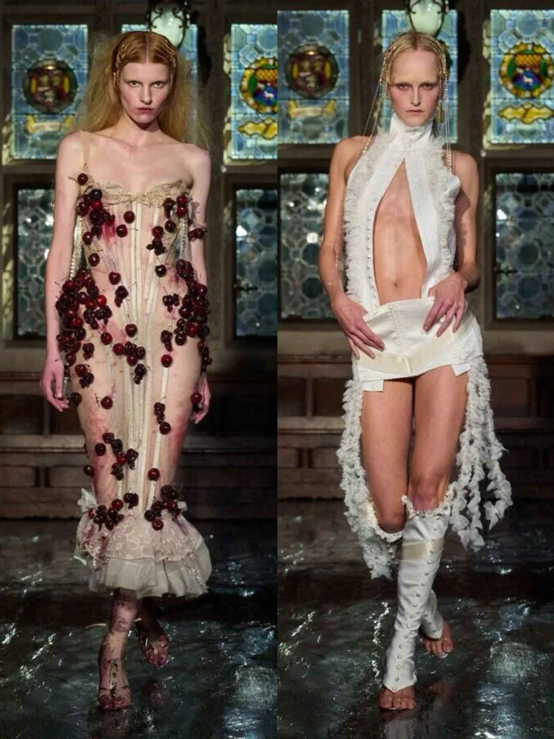 系列通过破碎蕾丝、撕裂布料等细节,隐喻女性从社会束缚中挣脱的过程。压轴造型中,深红连衣裙模特如火焰般燃烧,象征着自由,金属链条与柔软蕾丝、硅胶红樱桃形成对比,暗黑中透出俏皮。