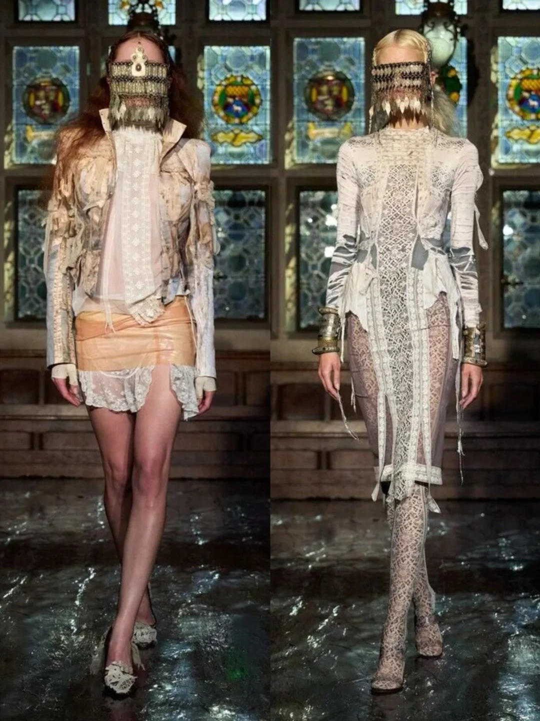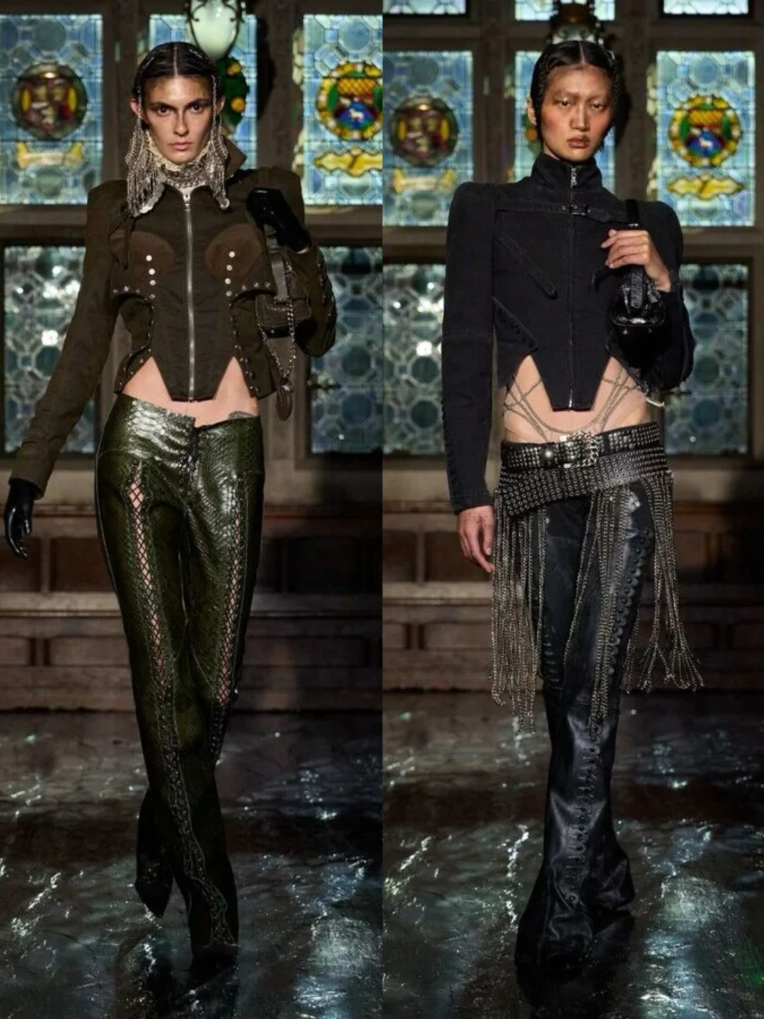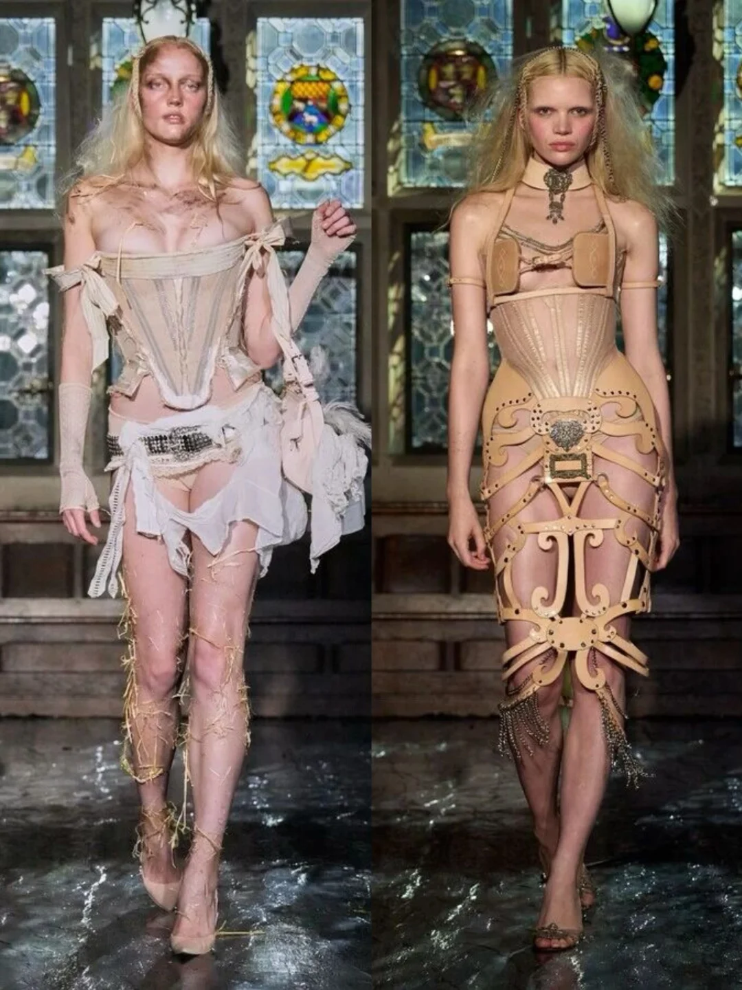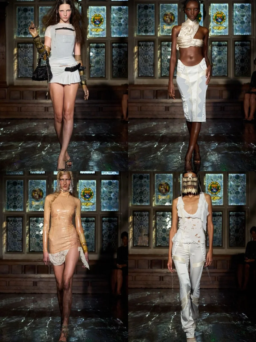 系列通过破碎蕾丝、撕裂布料等细节,隐喻女性从社会束缚中挣脱的过程。压轴造型中,深红连衣裙模特如火焰般燃烧,象征着自由,金属链条与柔软蕾丝、硅胶红樱桃形成对比,暗黑中透出俏皮。