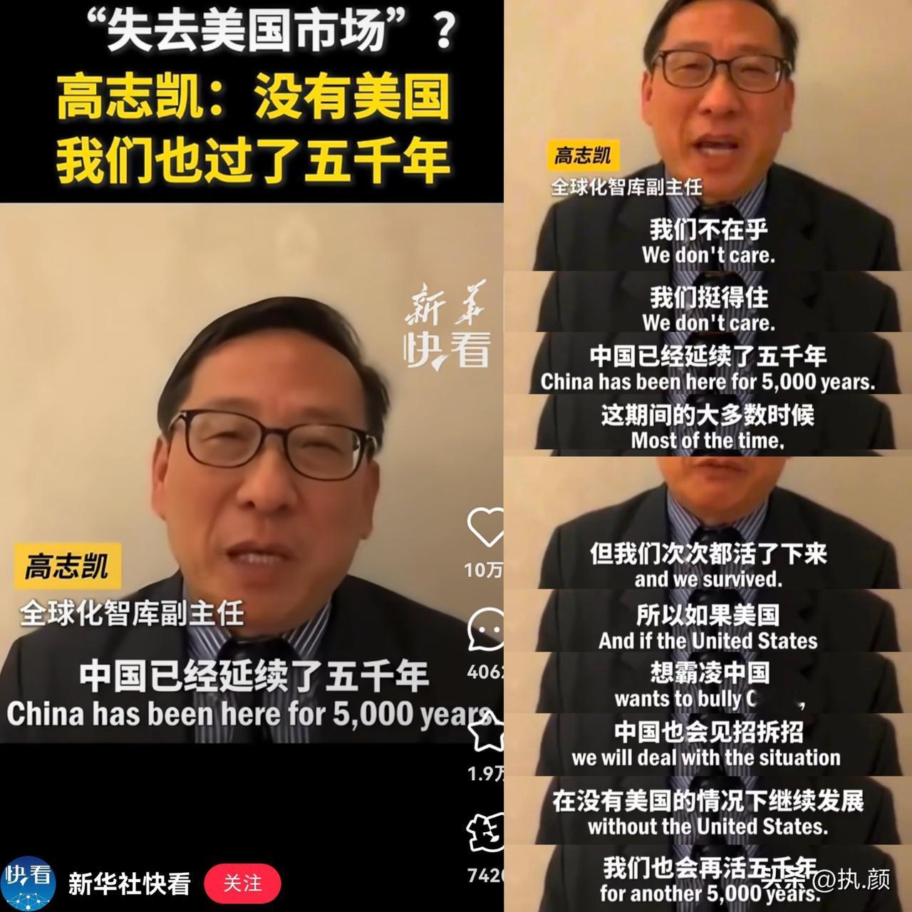 还得是高志凯!这波“历史暴击”直接把BBC记者干懵了 中美关税战正酣,BBC记者得意洋洋甩问题:“没了美国15%的出口市场,中国不得血流成河?”结果高志凯连怼三遍“我们不在乎!”直接搬出5000年历史,没美国的时候,中国活得挺好;以后没美国,只会更好。这哪是回答?分明是“降维打击”! 他太懂怎么戳西方痛点了:用历史当盾牌,用事实当利剑。中印边界划线、南海经度定调,每次回应都带着“文化自信”的狠劲。那些总想靠“市场威胁”拿捏中国的,在他面前连台词都接不住。