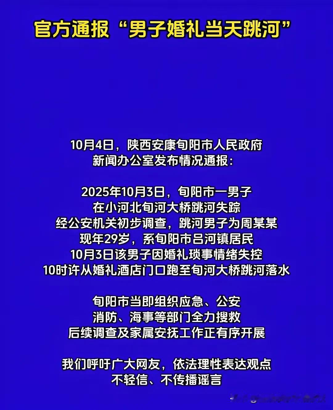 这个旬阳喜事变悲剧的事情折射了一个亘古不变的真理:“门当户对”真的很重要!这个”门当户对”不是指的夫妻双方家庭财富要匹配,而是双方的“三观”要契合。 新郎一时冲动跳河很多人说太不值,为了一点结婚琐事在结婚当天跳河确实是匪夷所思,但是矛盾的积累肯定不是一两天。小夫妻两人争执不下是肯定的,如果他们三观合拍,凡事有商有量,互相包容,能容错对方,那还有什么事情想不开要跳河呢? 这个令人悲痛的消息也提醒那些即将步入婚姻的年轻人,如果两个人在平日相处就总是遇事意见不和,每天都磕磕碰碰的,也都不能包容对方的错误,那这两个肯定是不适合走进婚姻殿堂的,双方还是及时止损吧!