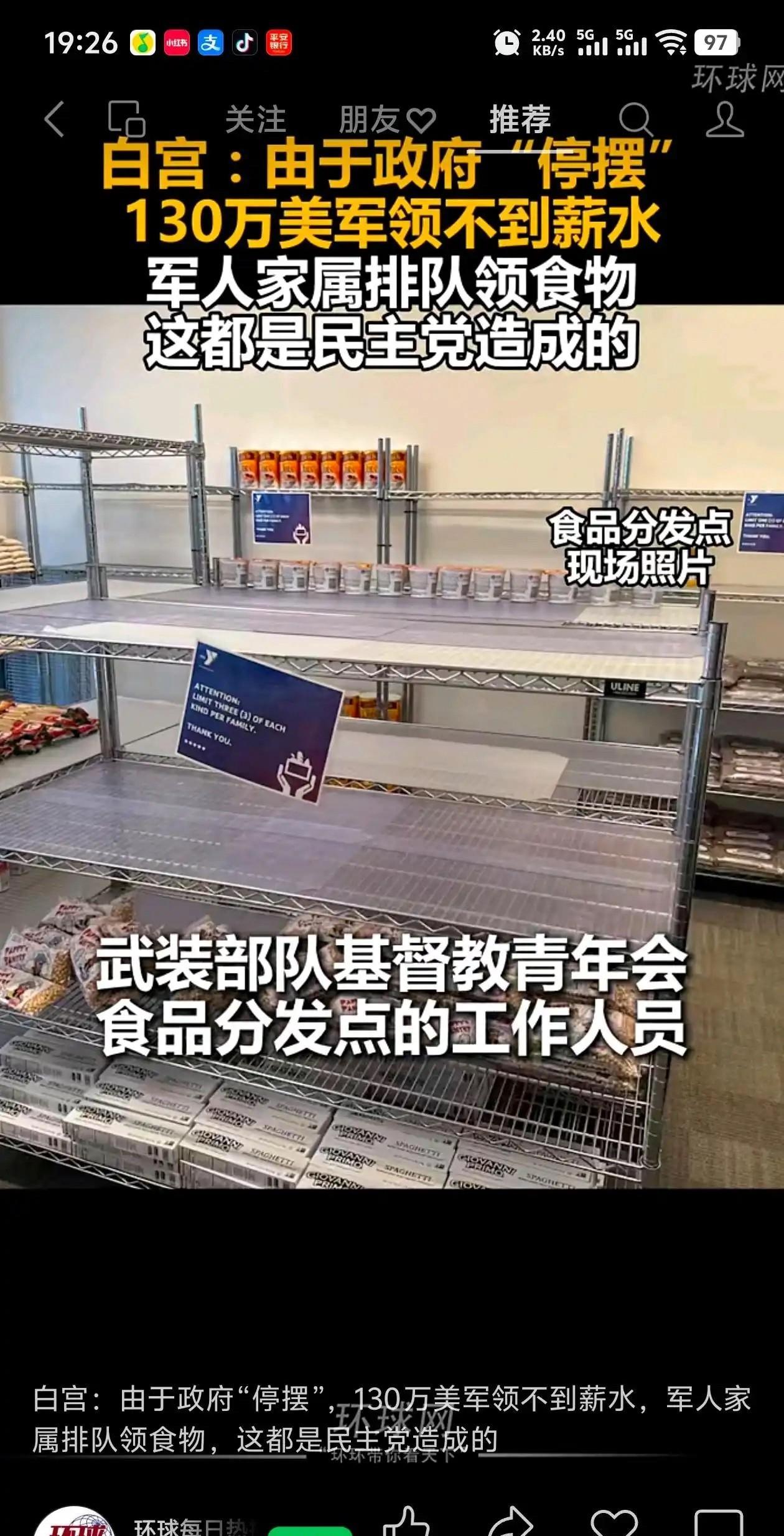 白宫:由于政府停摆,130万美军领不到薪水,军人家属排队领食物 最有钱最民主自由的美国国内怎么堕落成这样了,政府动不动停摆,美军发不出工资,连军队的家属都得靠排队领救济食物来维持生计。 #美政府停摆# #美国军人的无奈# #美政府停摆# #白宫裁员# #美国军人的无奈# #美国工作现状# #美国民生现状# #美国食物救济# #美国民生问题# #白宫放假#