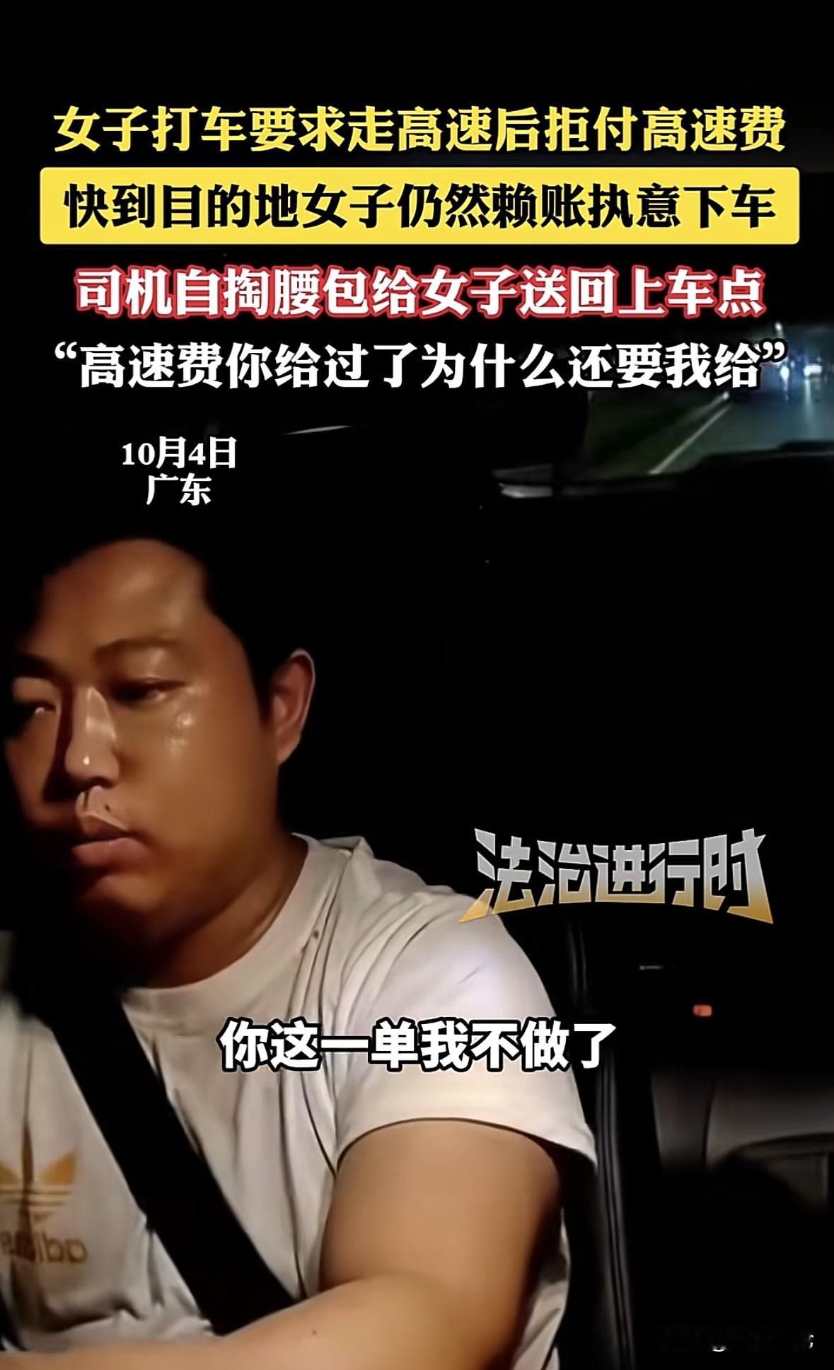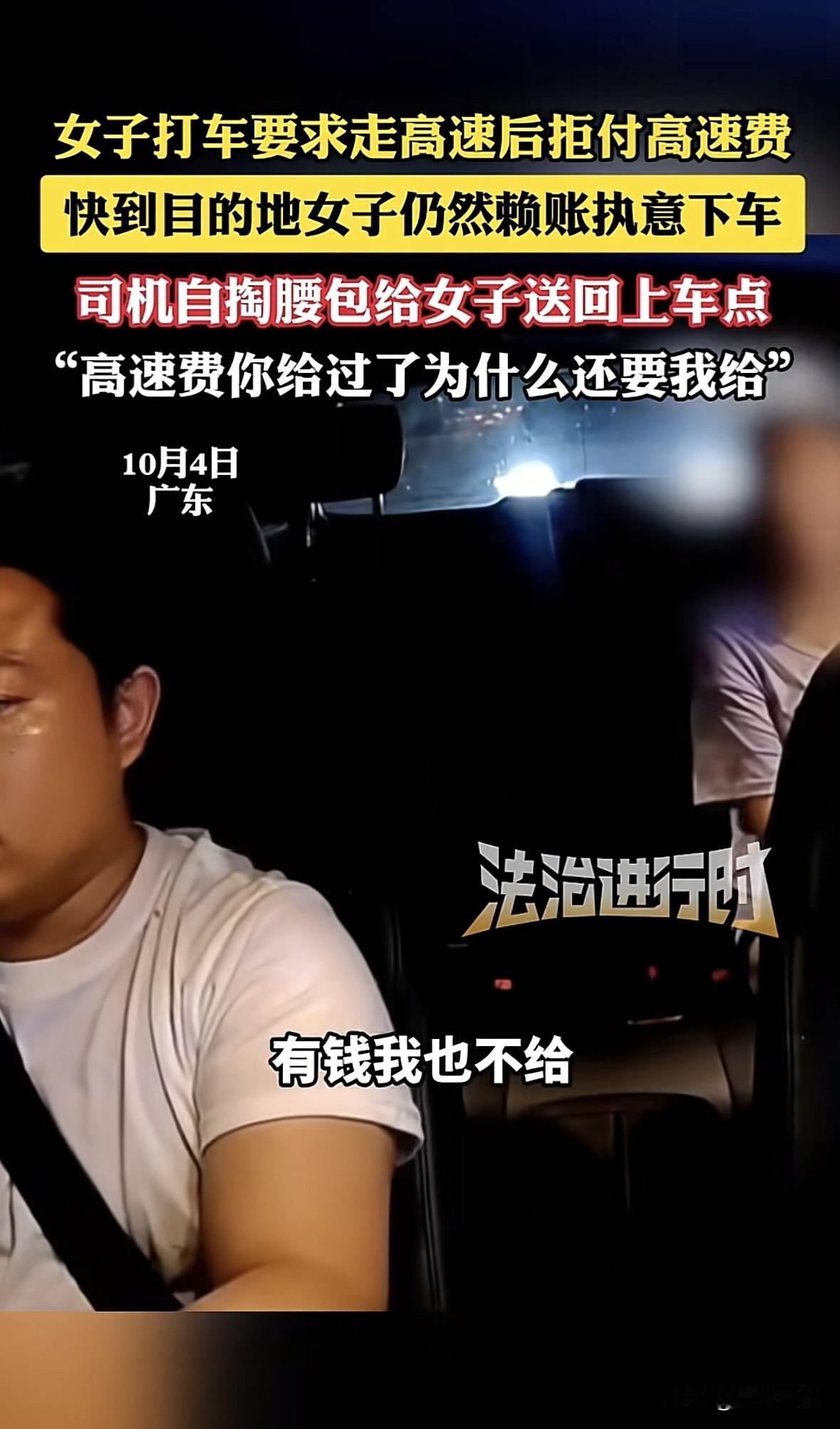 广东,女子打车去目的地,要求司机走高速,路上司机垫付了过路费,等快到目的地时,司机让女子把过路费一会一起结给他,女子觉得被坑了,眼睛一瞪反问司机,你不是已经付过费用了?为什么还要我掏钱?我没钱,我就是有钱也不给你!司机听后气得直接找地方掉头,说我现在就把你送回去,你这单我不接了! 司机老张这天接了个单子,一女子打车要去目的地,一上车就提出走高速。 老张想着高速确实快,也图个乘客满意,二话没说就上了高速。 哪成想,他这趟活儿是越跑越揪心,最后竟闹到要警察来评理。 事情是这样的,老张接单时,女子刚上车就发话了,说师傅咱走高速吧,我赶时间! 老张看女子催得急,想着高速确实比绕国道快挺多,就一脚油门出发了。 路上老张还盘算着,这单产生的过路费,按规矩是得乘客掏的,到时候和车费一块结就行。 到了收费站,老张先把钱垫付了。快到目的地时,他就告诉女子,过路费需要你一会一起结给我。 结果,他看到后视镜里女子坐在后排直摇手,说哎师傅,这过路费我可不掏啊!再说了你不都已经结钱了吗?为什么还要我出? 老张愣了神,说是你提出要走高速的,否则我就走国道了,那走高速产生的多余费用,肯定要你承担啊! 女子倒理直气壮,说反正你车都已经上了高速,也都快到了,你跟我说这些有用吗?我没钱,就算有钱也不会给你! 老张听得心里直犯堵,这趟活儿本就挣不了多少,再搭上高速费,这还能挣个啥?这不白跑了吗! 他试着和女子商量,可女子铁了心不掏钱,坐在后座直嘟囔,说不该我掏的钱,我就不掏,你爱咋咋地吧。 老张越想越憋屈,一气之下直接出高速找了个地儿掉转车头往回开。 女子一看路线不对劲,急得直拍座椅,说师傅你啥意思?你这是要往哪开?我要下车! 老张闷声说,既然你不掏高速费,那咱们就回到起点,我现在把你送回去,你这单我不拉了。 老张心想,哪怕这一单全部损失我自己认了,我也不愿意拉你这种不讲理的人。 女子气得直瞪眼,狂拍车门表示要下车,最后干脆在行驶过程中强行拉开车门,说要下去,老张怕有啥危险,不得不选择停车。 女子下了车就掏出手机拨了110,给民警倒起了苦水,说就因为我没给高速费,这司机开到半道要把我送回上车的地方,我现在不想坐他的车了,你们来接我一下。 警察到场时,女子委屈上得很,说我又没说不给车费,可这高速费凭啥算我头上? 老张也为自己说了句话,说打车走高速,高速费得乘客自己承担,这是常识,你要是一开始不想掏,就该和我商量走国道,对不对? 其实仔细想想,这事儿双方都有不是。张姐要是提前问清楚高速费谁掏,也不至于闹到警察来,老张要是事先说清楚规矩,也能少生这场气。 有人就问这名女子了,你打过车吗?顺风车平摊高速费,快车专车豪车,包括一口价,都是乘客出全部过路费 ,路线由平台规划的路线走,你想怎么走就怎么走? 大多数高速路近,时间段,路线平台规划生成距离计算费用,价格固定了,你要求改变路线,多的距离时间,司机白给你干? 也有人问是什么时候的事?国庆免费,平常如果你打车选择走高速,费用平摊,或者自己承担高速费,都有自己选择的,你要看清楚才下单,如果接受了就该给,不能耍赖皮。 说到底,出门在外互相体谅最要紧,不然省了小钱,倒添了大堵。 那么,从法律角度,怎么看待双方间的纠纷? 《民法典》第814条规定:旅客应当支付票款以及运输过程中应当由旅客支付的任何其他费用。旅客无票乘车、持失效客票乘车、超程乘车或者越席乘车的,应当补交票款,承运人可以按照规定加收票款;旅客不支付票款的,承运人可以拒绝运输。 女子和司机形成事实上的客运合同关系。女子上车时明确要求“走高速公路”,司机同意并实际驶入高速,此时高速过路费属于“运输过程中应当由旅客支付的其他费用”。 根据法条,女子有义务支付这笔费用。 她事后以“没钱”“有钱也不给”为由拒付,构成违约。司机在多次协商无果后选择掉头送回,本质上是行使合同履行抗辩权,也就是因旅客拒绝支付必要费用,承运人有权中止运输服务。 《民法典》第577条规定:当事人一方不履行合同义务或者履行合同义务不符合约定的,应当承担继续履行、采取补救措施或者赔偿损失等违约责任。 女子拒付高速费的行为属于“不履行合同义务”,需要承担违约责任。 具体来说,女子需要补交高速费和基础车费,完成运输合同的本约义务。 其次,司机因为女子拒付导致额外成本,如时间成本、燃油消耗,可主张赔偿。 司机虽然选择“送回起点”实为减少自身损失,但如果因此产生空驶费用,可依据该法条向女子追偿。 对于这件事,你怎么看? 关注@一案一论