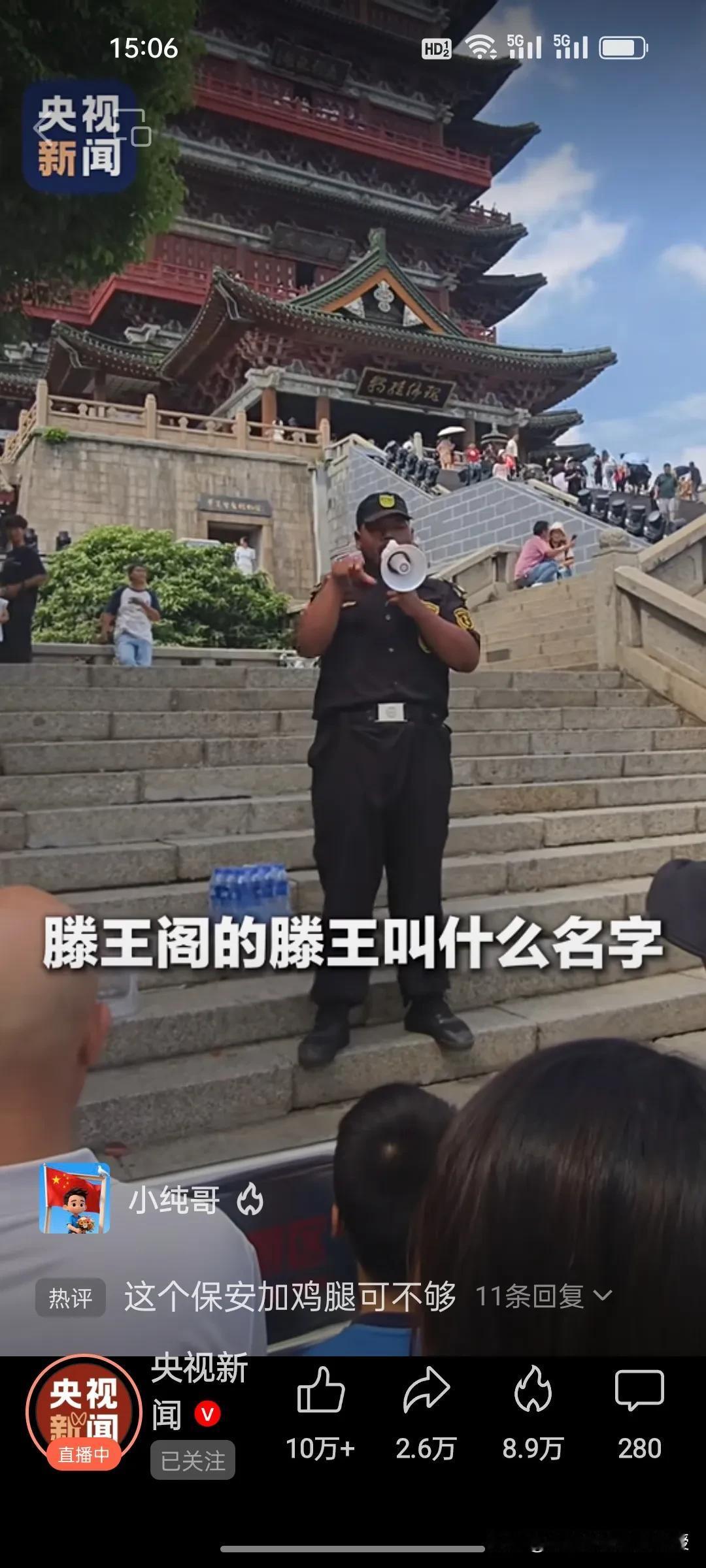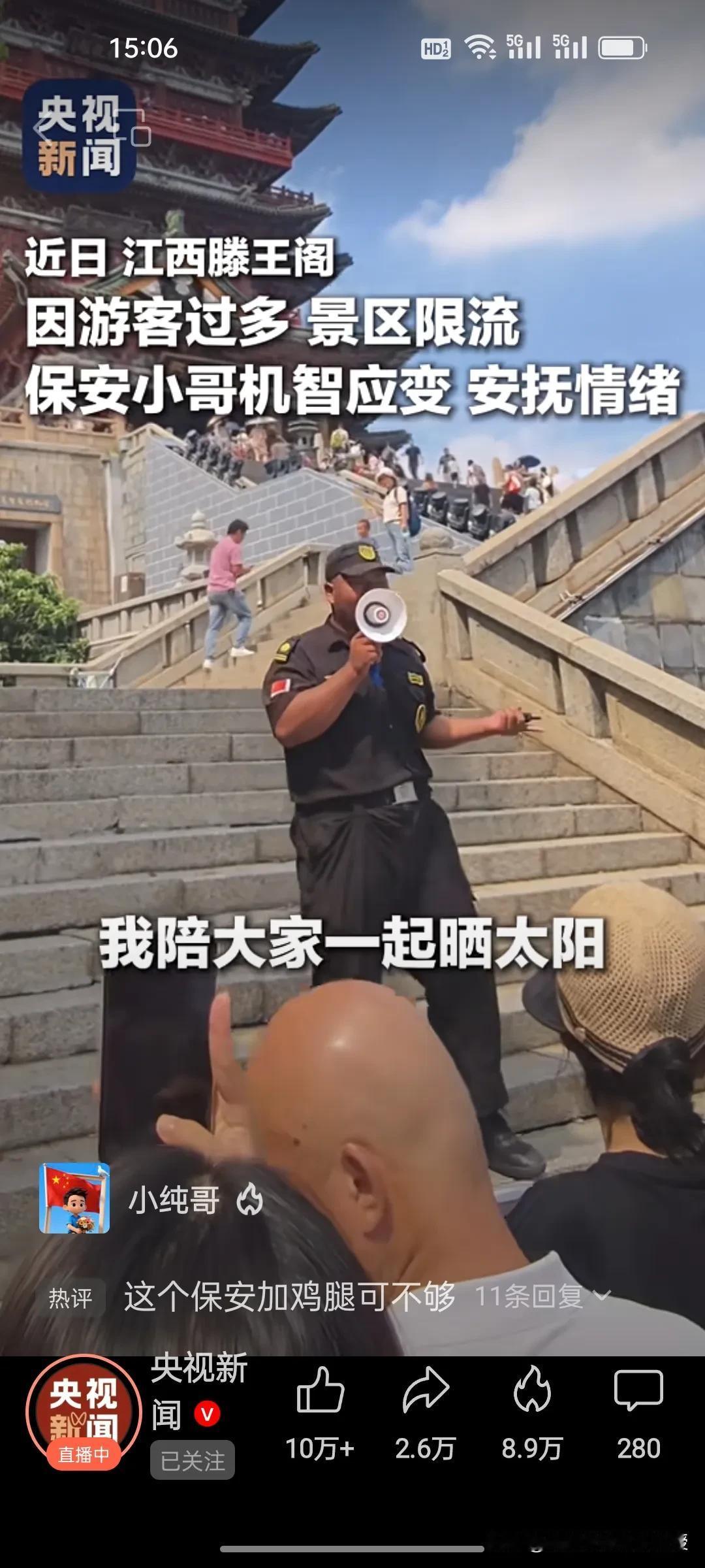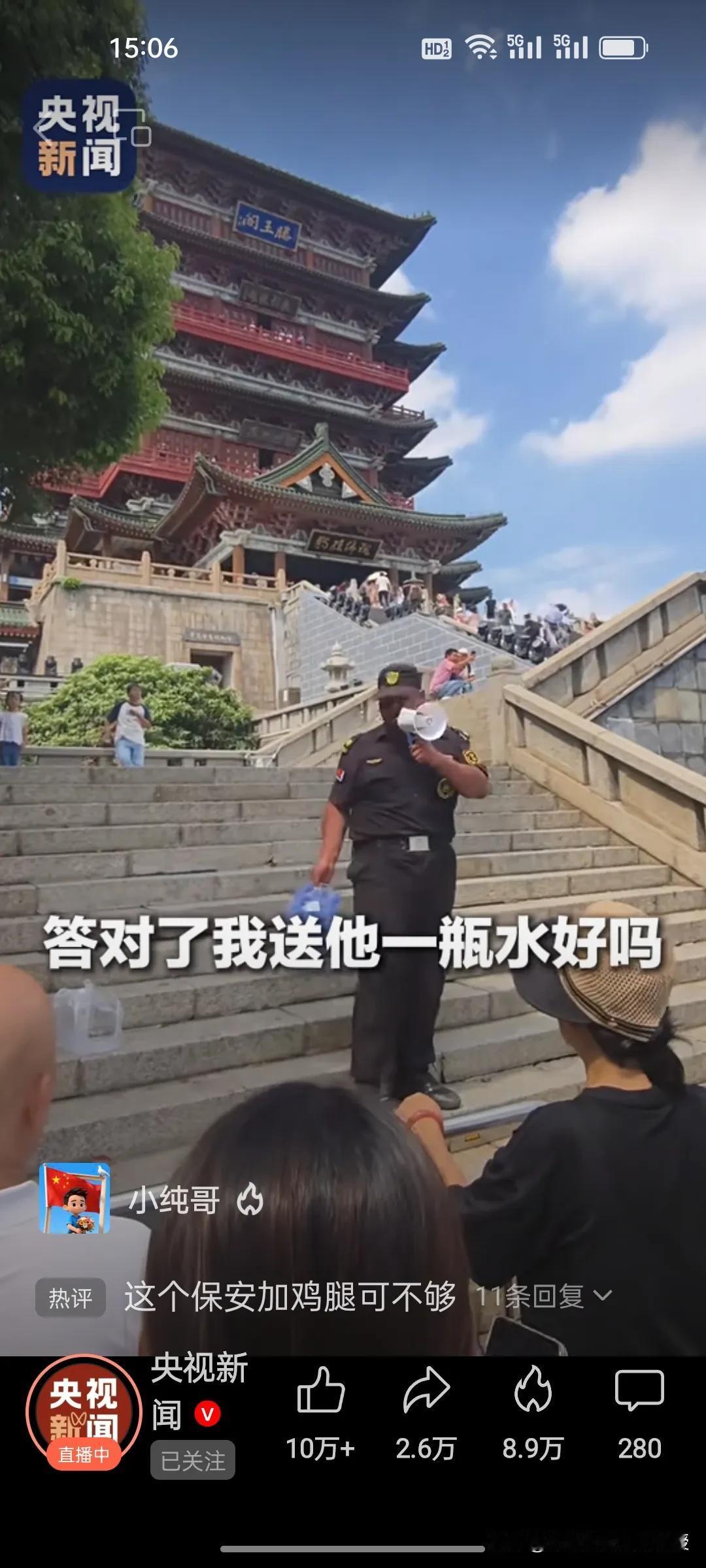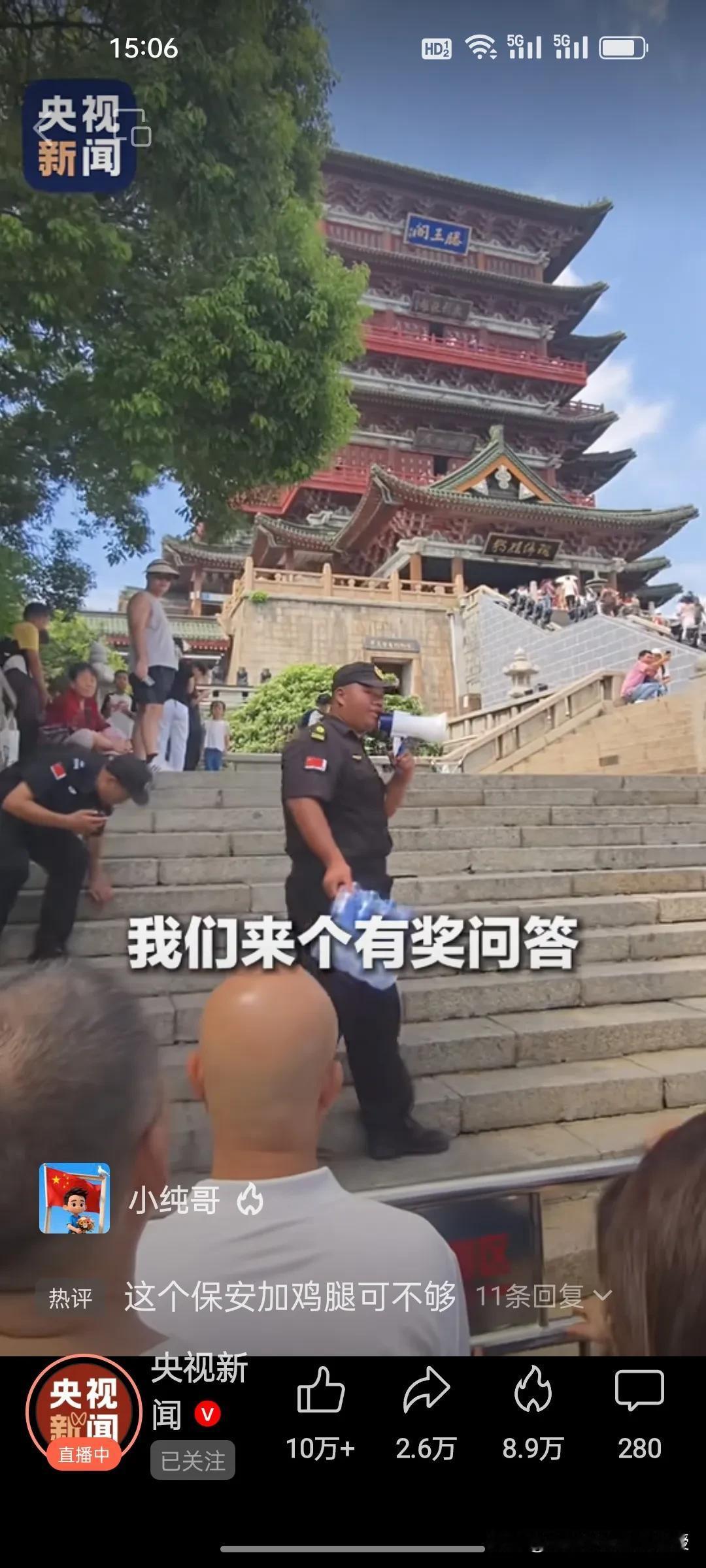 这名滕王阁景区的机智应变的保安让《央视新闻》都转发了!滕王阁有这样的保安真的让景区加分,江西文旅不止要宣传鸡排哥,更要给这位保安加鸡腿! 由于游客太多,滕王阁不得不限流,但是游客在太阳底下晒得太难受,这个保安灵机一动,想出了安抚游客情绪的好办法,他搬来一箱矿泉水,来个有奖竞赛的小游戏缓解大家的等待焦急的气氛。还让大家知道了滕王原来叫李元婴。游客本来还有些埋怨,觉得景区游玩等待时间过长,现在有个小游戏还能赢矿泉水,确实很不错。 国庆节各大景区都是人山人海,但是有这样温情举动的保安还是真的很稀罕,怪不得《央视新闻》都转发了,确实要给这个保安小伙子点个赞!让滕王阁景区的好感也大大加分!