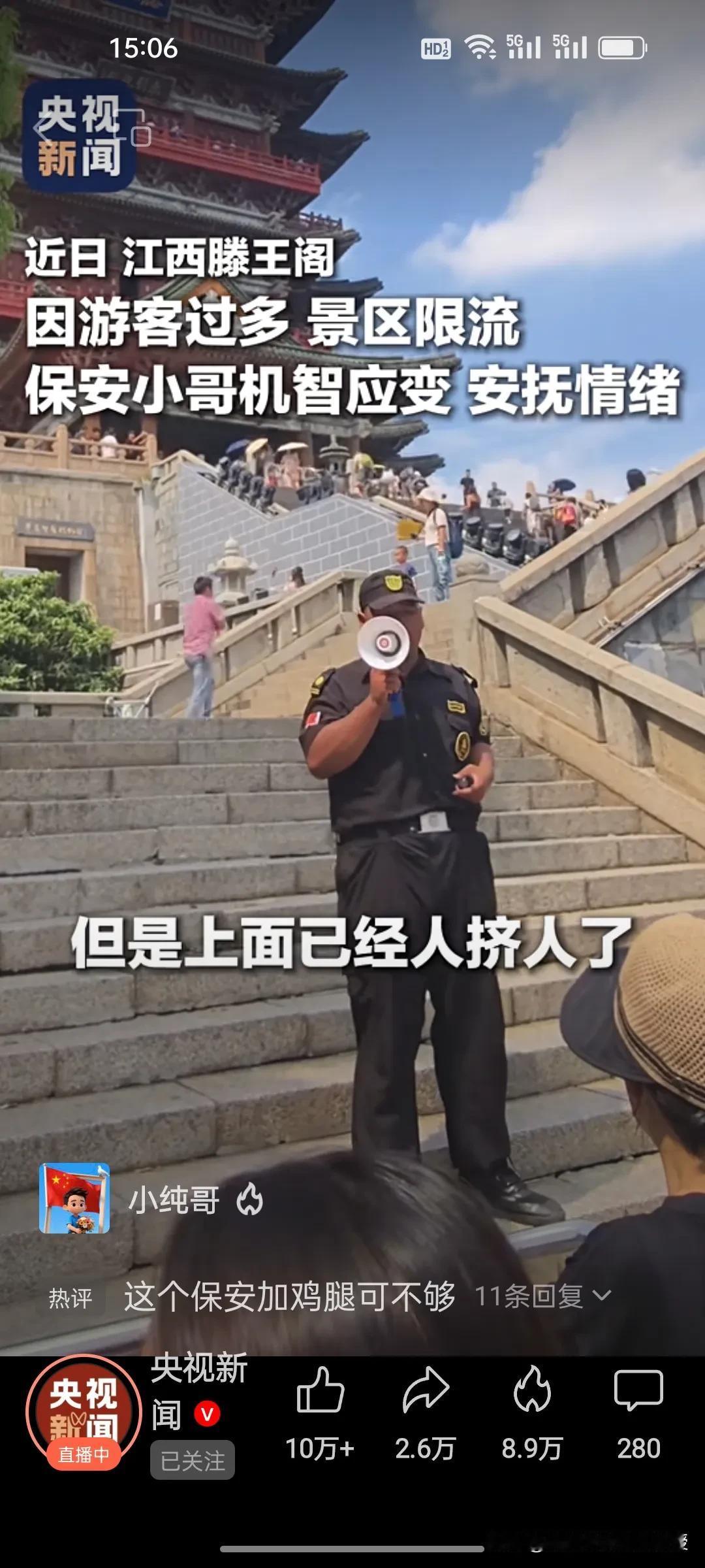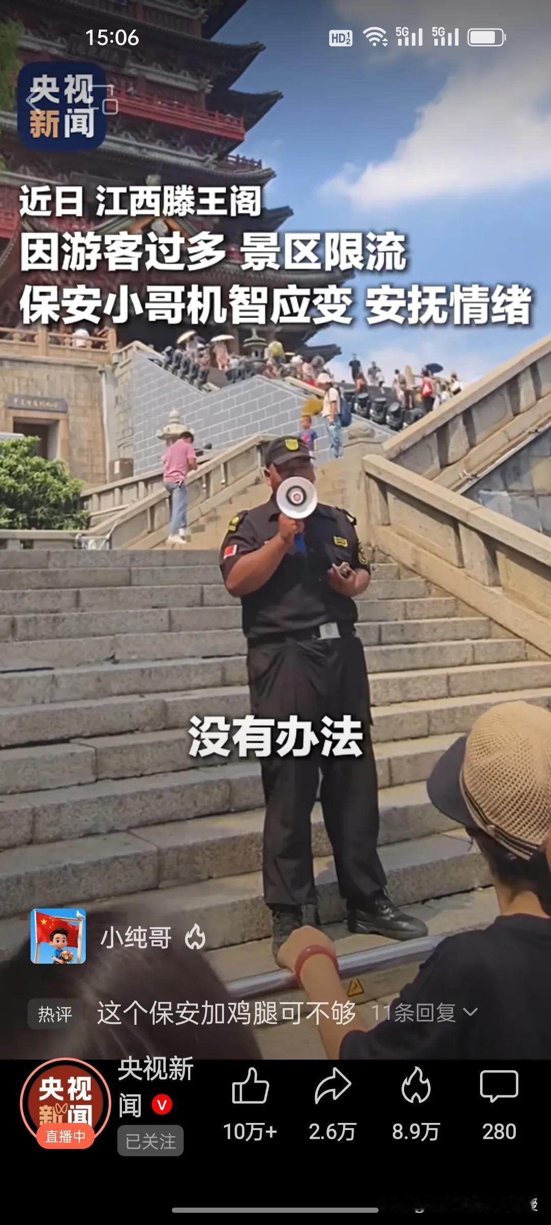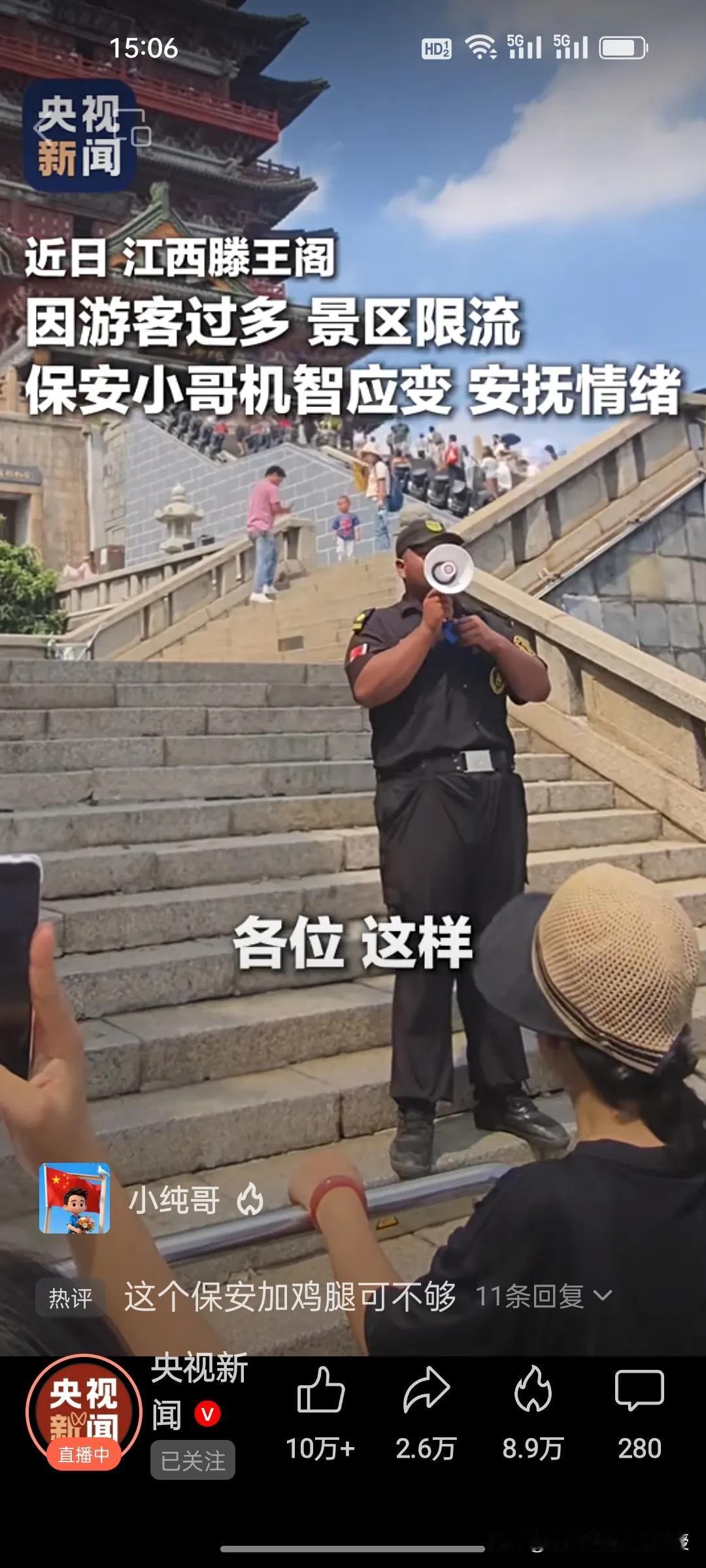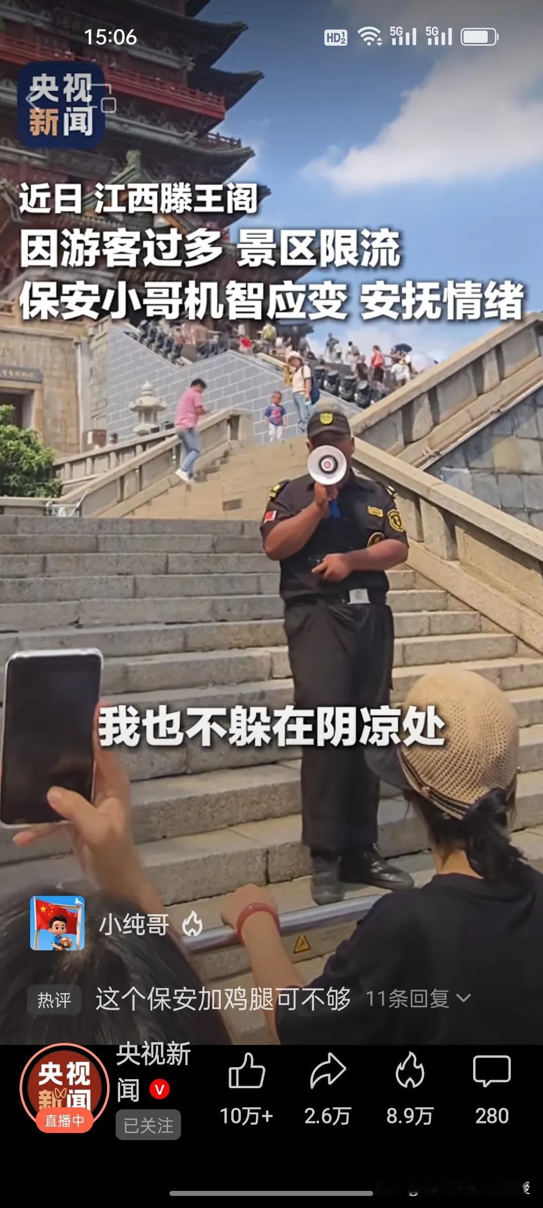 这名滕王阁景区的机智应变的保安让《央视新闻》都转发了!滕王阁有这样的保安真的让景区加分,江西文旅不止要宣传鸡排哥,更要给这位保安加鸡腿! 由于游客太多,滕王阁不得不限流,但是游客在太阳底下晒得太难受,这个保安灵机一动,想出了安抚游客情绪的好办法,他搬来一箱矿泉水,来个有奖竞赛的小游戏缓解大家的等待焦急的气氛。还让大家知道了滕王原来叫李元婴。游客本来还有些埋怨,觉得景区游玩等待时间过长,现在有个小游戏还能赢矿泉水,确实很不错。 国庆节各大景区都是人山人海,但是有这样温情举动的保安还是真的很稀罕,怪不得《央视新闻》都转发了,确实要给这个保安小伙子点个赞!让滕王阁景区的好感也大大加分!