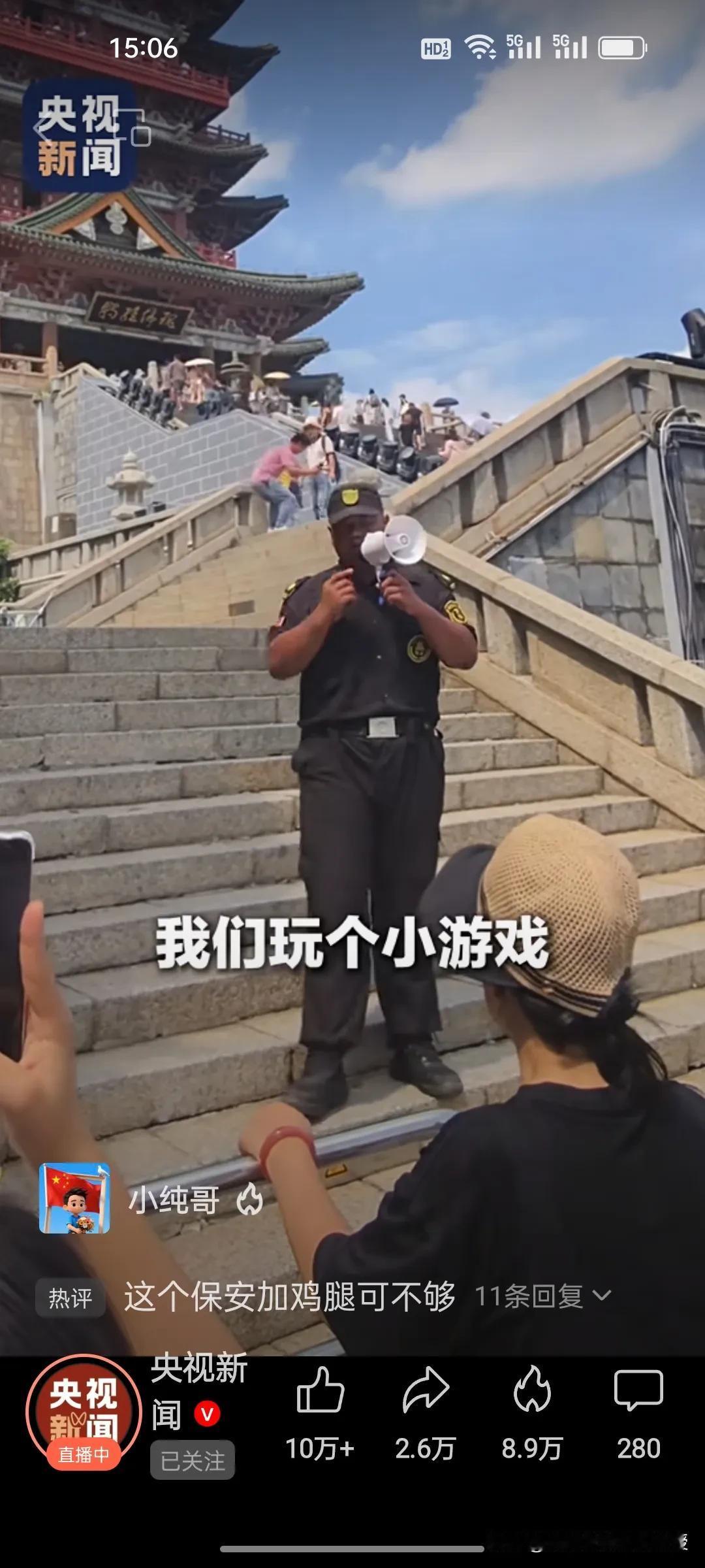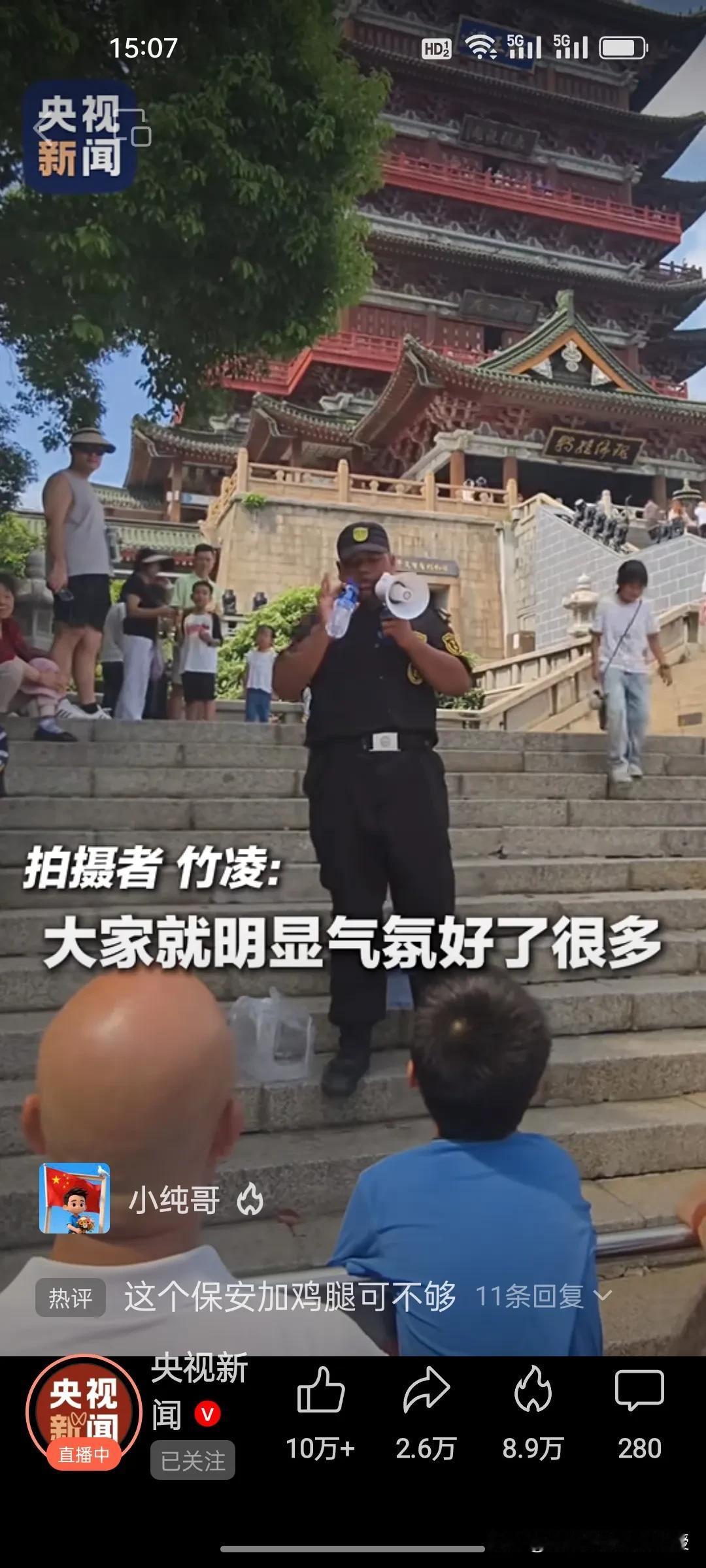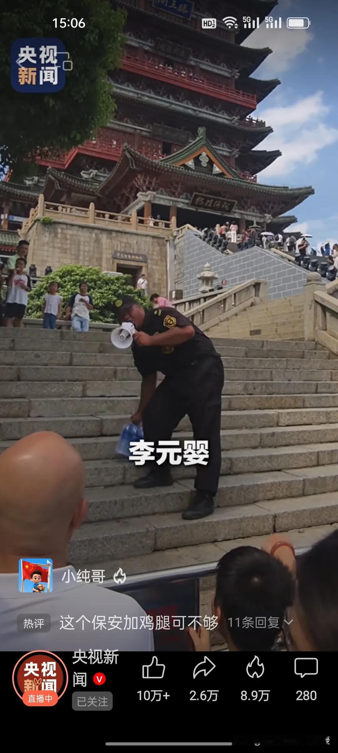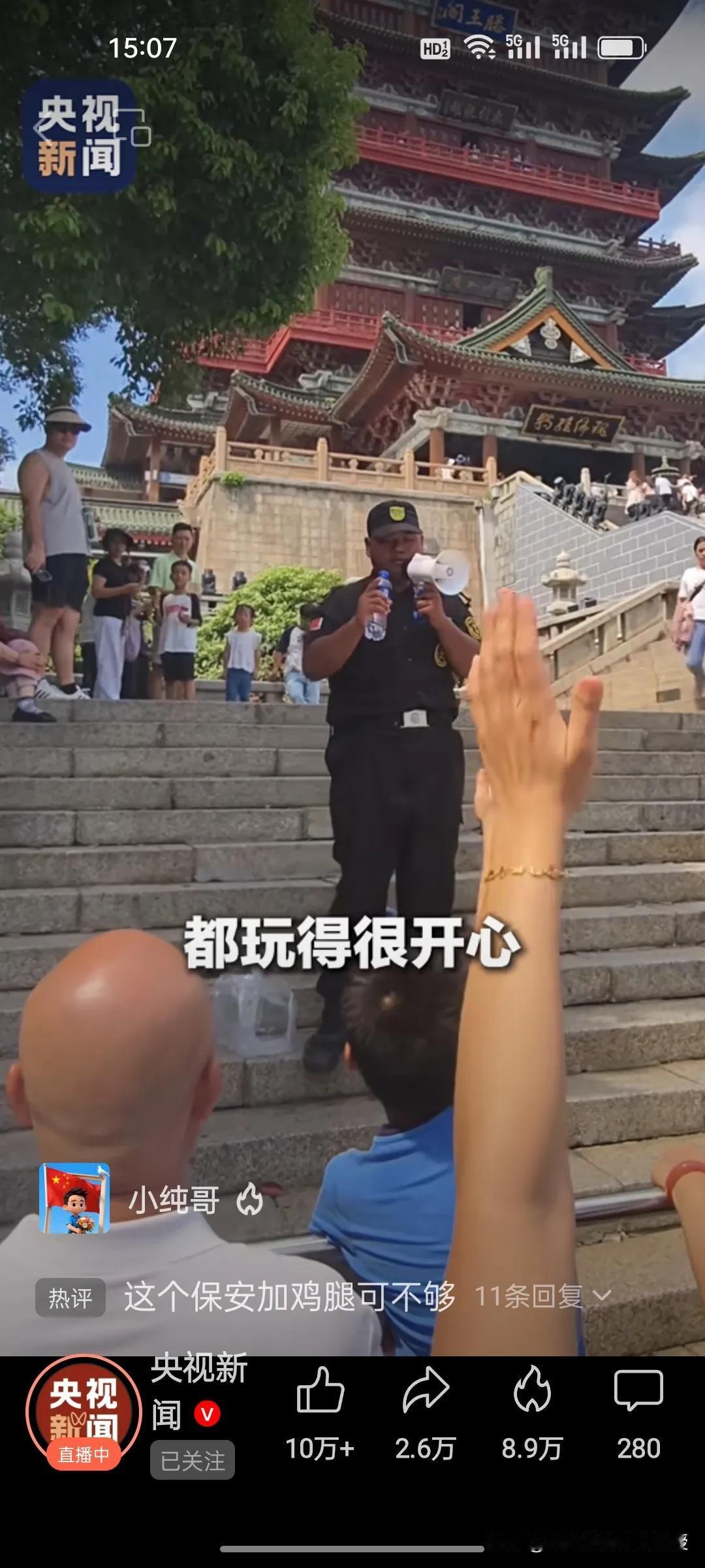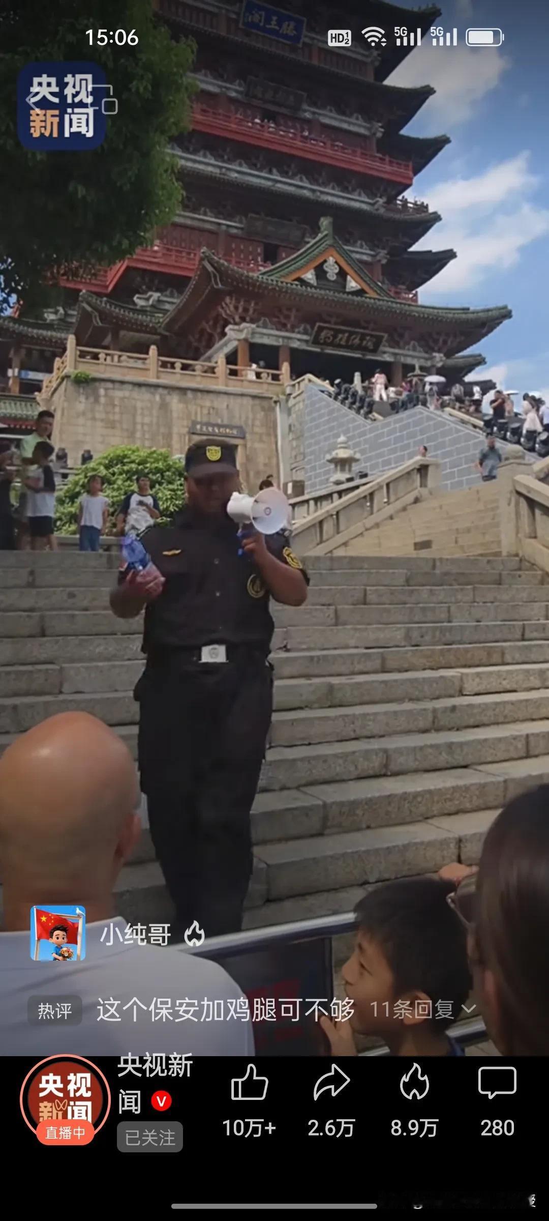 这名滕王阁景区的机智应变的保安让《央视新闻》都转发了!滕王阁有这样的保安真的让景区加分,江西文旅不止要宣传鸡排哥,更要给这位保安加鸡腿! 由于游客太多,滕王阁不得不限流,但是游客在太阳底下晒得太难受,这个保安灵机一动,想出了安抚游客情绪的好办法,他搬来一箱矿泉水,来个有奖竞赛的小游戏缓解大家的等待焦急的气氛。还让大家知道了滕王原来叫李元婴。游客本来还有些埋怨,觉得景区游玩等待时间过长,现在有个小游戏还能赢矿泉水,确实很不错。 国庆节各大景区都是人山人海,但是有这样温情举动的保安还是真的很稀罕,怪不得《央视新闻》都转发了,确实要给这个保安小伙子点个赞!让滕王阁景区的好感也大大加分!