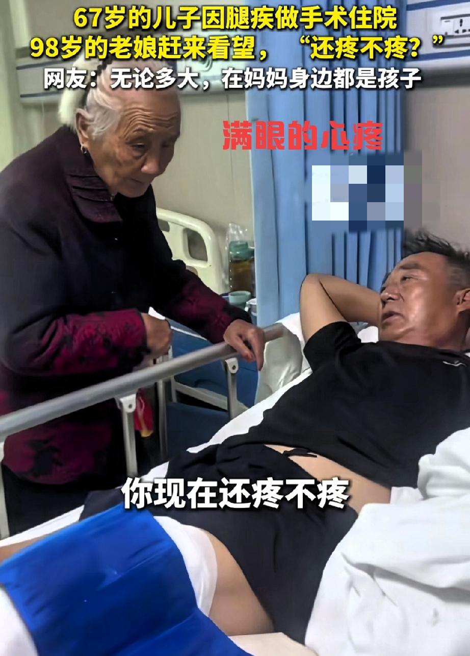 这则新闻确实令人动容。 一位67岁的儿子住院,98岁的母亲拄着拐杖来看他,第一句话还是那句最朴素的“还疼不疼”。 在那一刻,年龄仿佛失去了意义。 无论我们多大,在父母眼里永远是需要被保护的孩子。 这让我想到,父母的爱是一种“牵挂的本能”,它不会因为我们成年而减弱。 而子女的“善意隐瞒”,也是爱的一种表达方式。 这个故事还告诉我们一个更深的道理:一个家庭的幸福,很大程度上取决于“家风”。 从这位母亲的整洁利落,到家人之间的相互扶持,都体现了良好的家庭氛围。 在快节奏的现代生活中,我们不妨也多向这位母亲学习,用最简单的话语表达关心;同时,也向这位儿子学习,把爱落实在具体的陪伴和照顾上。 愿我们都能珍惜与父母相处的时光。看完这个故事,你有什么想对自己父母说的话吗?欢迎在评论区分享你的心声。