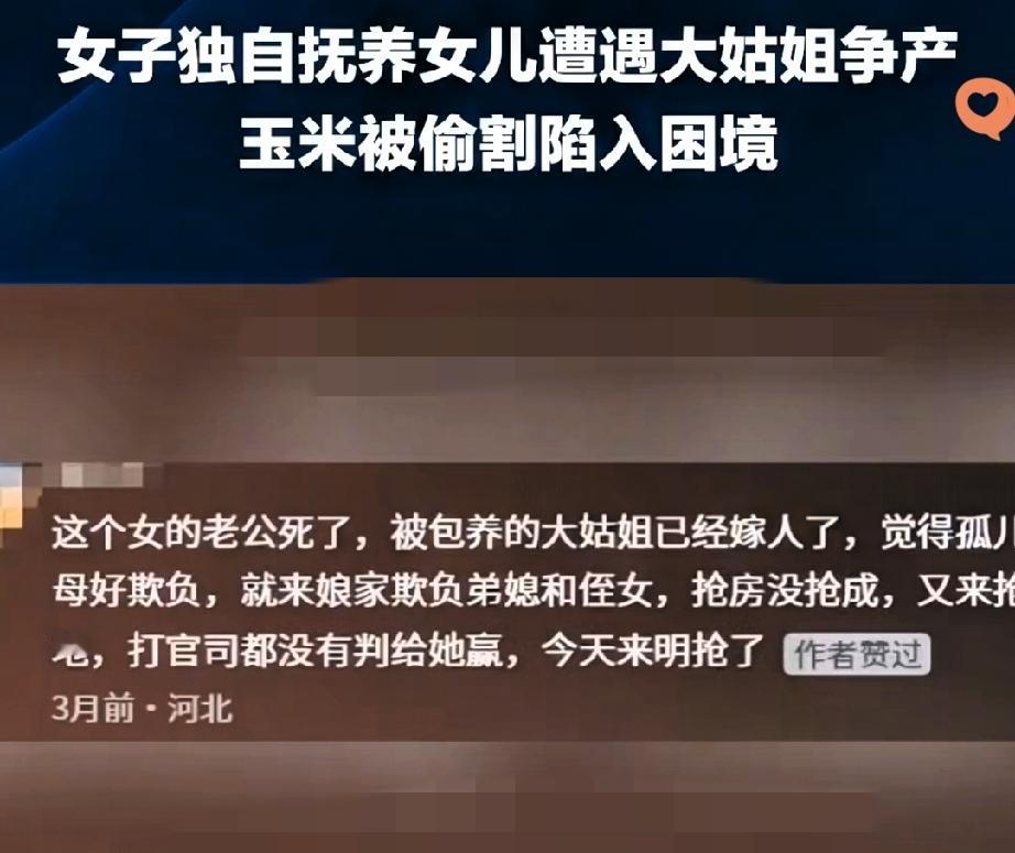 这哪是偷玉米,分明是抢人家母女的活路! 河北这位女子,丈夫走了五年,一个人带4岁的遗腹女,6亩玉米是她顶着大太阳种出来的,本想卖了给娃交学费、买棉袄。结果官司刚打赢,大姑姐凌晨就把玉米割了个精光。 最寒心的是,这大姑姐早跟家里断了联系,丈夫去世都没露面,却盯着家产不放,甚至质疑孩子不是亲的。 法律都判了她没份,她还来这一手。 亲情在利益面前,咋就变得这么难看?这割的不只是玉米,是人家日子里的盼头。 真希望能早日找回公道。你们觉得,亲戚之间最该守住的底线是什么?评论区聊聊。