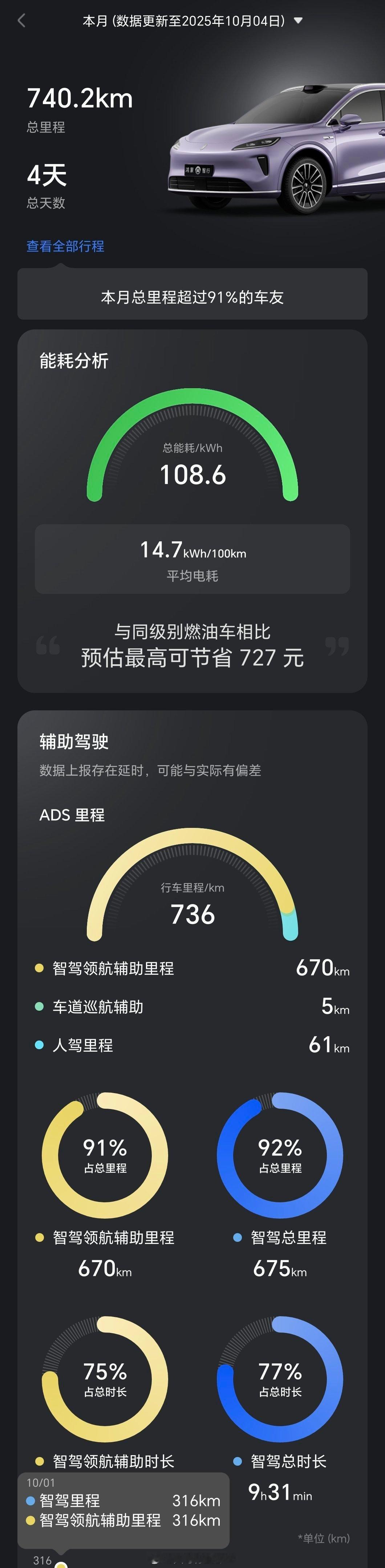 10月4天,开了尚界H5 740km,平均能耗14.7kWh/100km,智驾占比92%,除了市区为了高效穿梭,其他基本都是用智驾开了,很好用。尚界[超话]