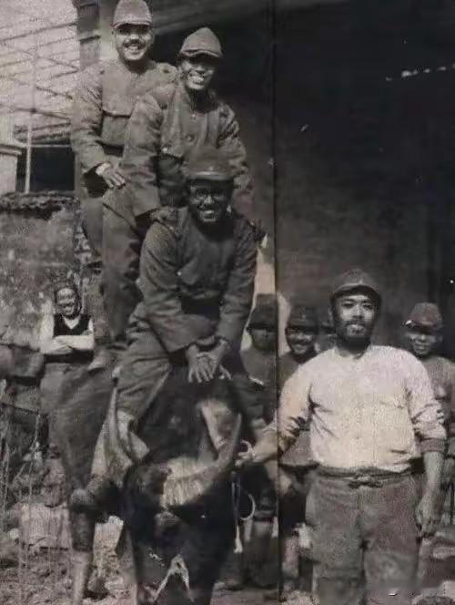 三个日本鬼子站在牛背上,这头牛遇到它们也够倒霉的了,虽然小鬼子的体重不是很沉,但