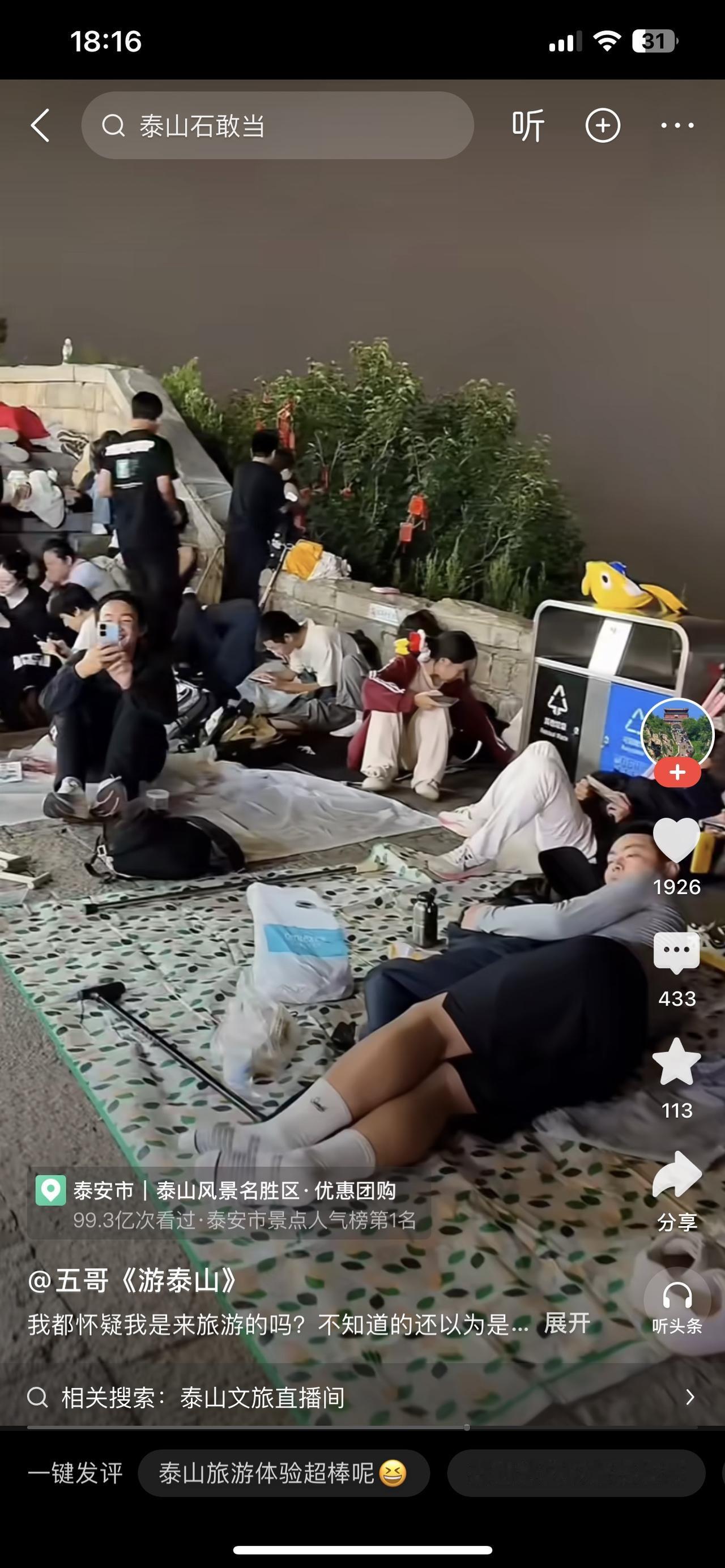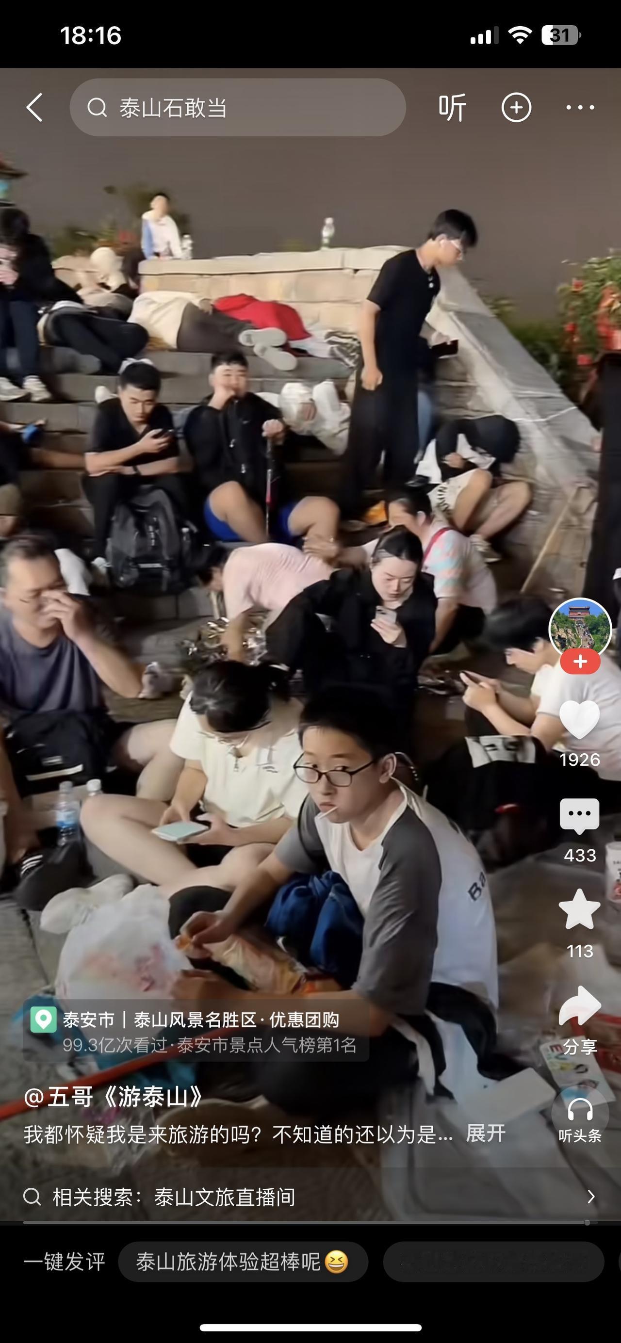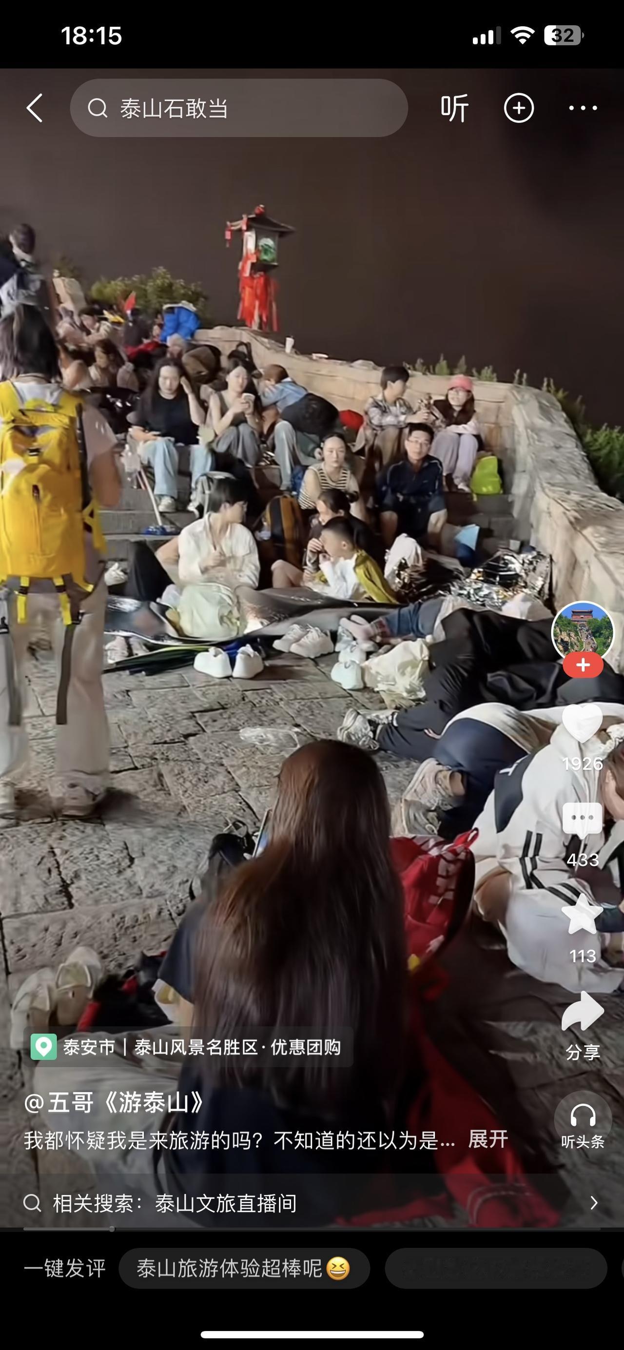 我都怀疑这是来旅游的吗?不知道的还以为是来逃难的呢……上厕所怎么办[捂脸][捂脸] 这是泰山风景名胜区的一处场景,画面中许多游客或坐或躺聚集在台阶及周边区域。 泰山泰山旅游 泰山是中国著名的五岳之首,以雄伟壮丽的景色和深厚的文化底蕴吸引着大量游客,尤其是夜间登山看日出的活动很受欢迎,这些游客可能是在登山途中休息或等待日出。 这种场景体现了泰山旅游的火爆,也反映出游客在登山过程中的疲惫与对景观的期待,同时也能看出泰山作为热门旅游目的地的超高人气。初次泰山旅游 泰山绝美打卡地