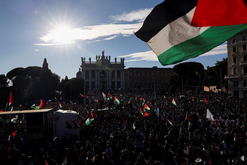 当天,罗马、米兰、都灵等百余座城市爆发大规模游行,示威人群高喊“解放巴勒斯坦”等口号,游行队伍甚至经过罗马竞技场等地标。