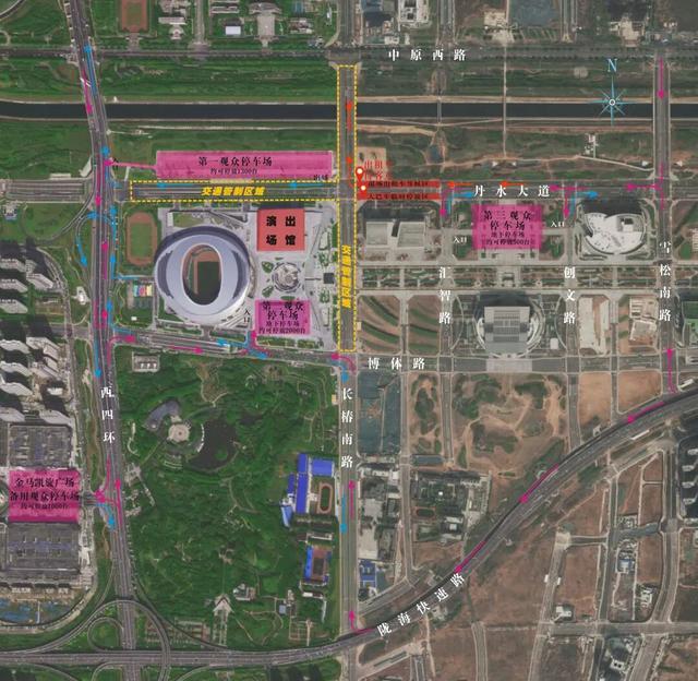 (二)丹水大道(西四环至长椿南路段双向),禁止各类机动车和非机动车通行(工作车辆除外)。根据奥体中心活动现场交通流量,视情将丹水大道限制通行路段梯次延长至雪松南路以西和凯旋路以西。