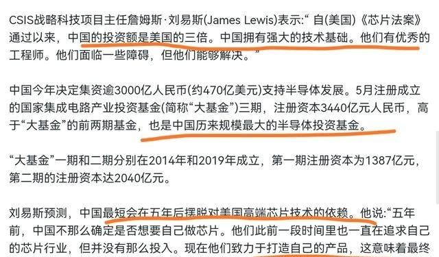 美国智库出来说实话了!美国智库华盛顿智库战略与国际研究中心战略科技项目主任詹姆斯·刘易斯表示,中国最短会在五年后摆脱对美国高端芯片技术的依赖,美国的科技封锁将完全失败。为什么会这样呢? 刘易斯在公开场合指出,中国将在短期内实现高端芯片的自给自足,美国的限制措施难以持续有效。他解释中国工程师队伍规模庞大且能力强,他们面对技术壁垒时,通过反复试验找到路径。刘易斯强调,中国半导体投资力度远超美国,大约达到美国的数倍规模。他表示中国已推出多轮国家基金,用于推动芯片领域进步,这体现出明确目标。根据权威资料,中国工程师操作设备,测试新工艺,逐步优化设计。刘易斯提到,中国在中低端芯片生产上已建立稳固基础,不是从零起步,这为向上发展提供支撑。他强调,这些投资和人才储备使中国突破成为现实。刘易斯认为,美国的举措反而为中国企业创造市场机会,在竞争减弱的环境中加速创新。 中国企业扩大生产线,采购本土设备,团队讨论方案,调整参数。刘易斯在2022年的一份分析中指出,中国已投入数百亿美元构建本土芯片能力,尽管面临外部压力,但依赖度正在缩小。他说明中国政府支持下的基金如何分配资源。权威报告显示,中国第三期大基金聚焦先进制造,覆盖设计和封装环节。工程师组装晶圆,监控机器运行,确保产量提升。刘易斯列出数据:中国投资额是美国的倍数,这让本土企业获得更多资金用于研发。研究人员输入代码,模拟芯片性能。他补充说,中国工程师数量众多,他们分工协作,攻克具体难题,如光刻技术优化。团队传递文件,辩论方案细节,最终确定实验步骤。 刘易斯表示,美国封锁忽略了中国现有实力,中国已在全球供应链中占据中低端位置。这为高端突破铺平道路,只需时间积累。工人操作机器,芯片部件流动。根据2024年数据,中国芯片自给率已达16%,但通过持续投入,正向更高目标推进。刘易斯在2025年的一次会议中,重申观察:中国决心打造完整产业链,美国政策难以阻挡。他说明,市场空间扩大是中国企业的优势。在缺乏外部竞争的情况下,本土公司快速迭代产品。企业拨款用于新厂建设。权威分析指出,美国出口管制促使中国转向本土供应商,设备曝光率升至34%,显示自立趋势。 工程师放置样品,连接仪器,记录数据波动,逐步验证可靠性。刘易斯认为,中国制度能整合资源,包括资金和政策支持,帮助半导体企业加快步伐。政府协调采购,优先本土产品,企业响应号召,扩大产能。研究者绘制流程图,标注关键节点,讨论如何绕过技术限制。自动化臂抓取部件,组装线运转。刘易斯在报告中警告,美国的遏制可能适得其反,催生更强对手。中国企业利用市场空白,推出创新解决方案,如在设计软件上的突破。 2025年资料显示,中国芯片产业面对制裁,仍保持增长,国内设备使用率提升。工程师运行程序,屏幕显示结果,他们调整算法,继续迭代。刘易斯强调,半导体产业已有数十年历史,中国从中低端积累经验,向高端延伸。历史资料证实,中国早在上世纪就涉足芯片制造,奠定基础。他解释为什么失败几乎不可避免:人才和资金的双重优势。研究者观察晶体结构,标记缺陷。权威来源指出,中国大基金已投资多家企业,推动从设计到测试的全链条发展。刘易斯在国际论坛上,交换名片,与同行交流,分享对全球供应链的看法。中国企业抓住机会,填补市场空白,开发替代技术。销售团队展示样品,客户询问性能参数。 刘易斯认为,制度优势体现在资源调动上,政策倾斜让企业获得补贴和优先采购。货车运来原材料,工人卸货。2025年报告指出,中国半导体产量持续上升,尽管外部压力,但创新步伐未停。工程师保存文件,准备下一轮测试。刘易斯在分析中指出,美国政策忽略了中国决心,这将导致封锁失效。中国企业扩展海外合作,规避部分限制,保持供应链稳定。中国通过这些因素,实现芯片自主化目标。刘易斯强调数据支持他的判断。