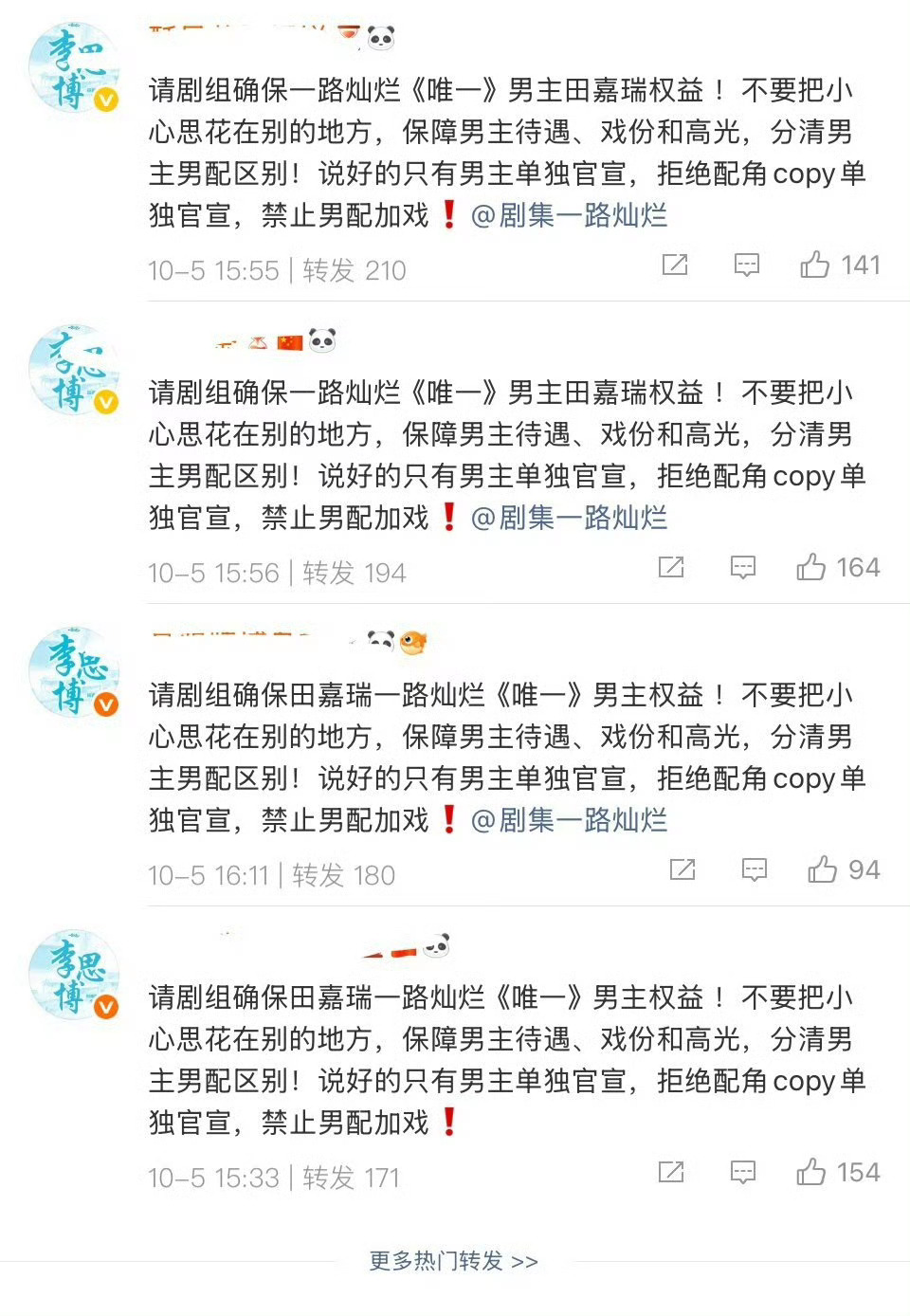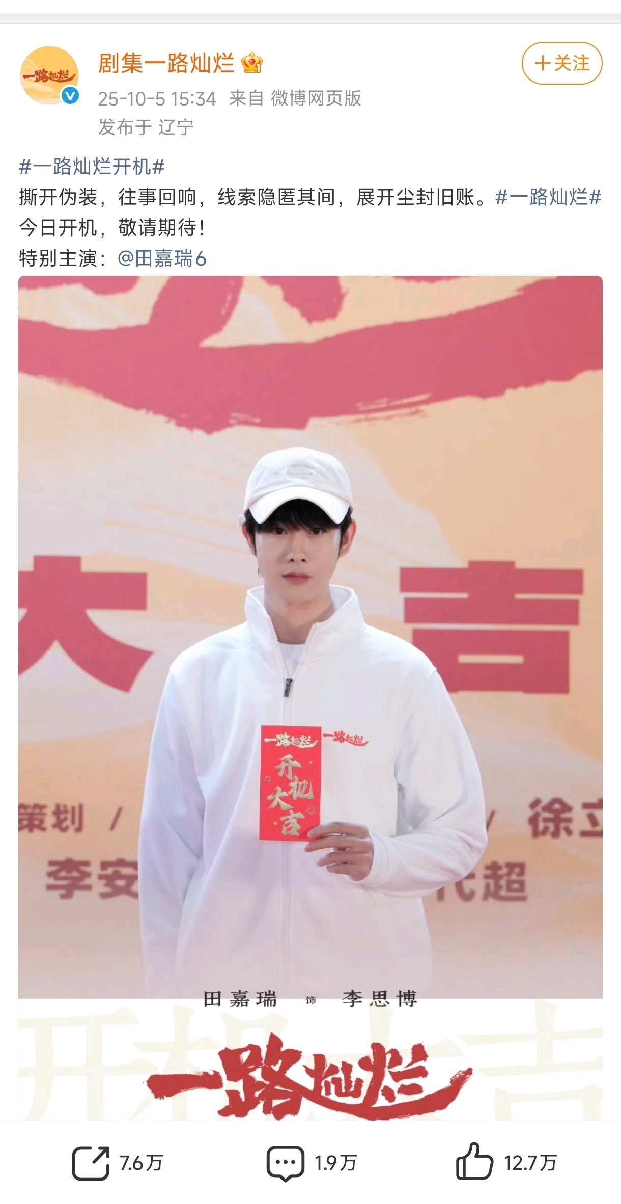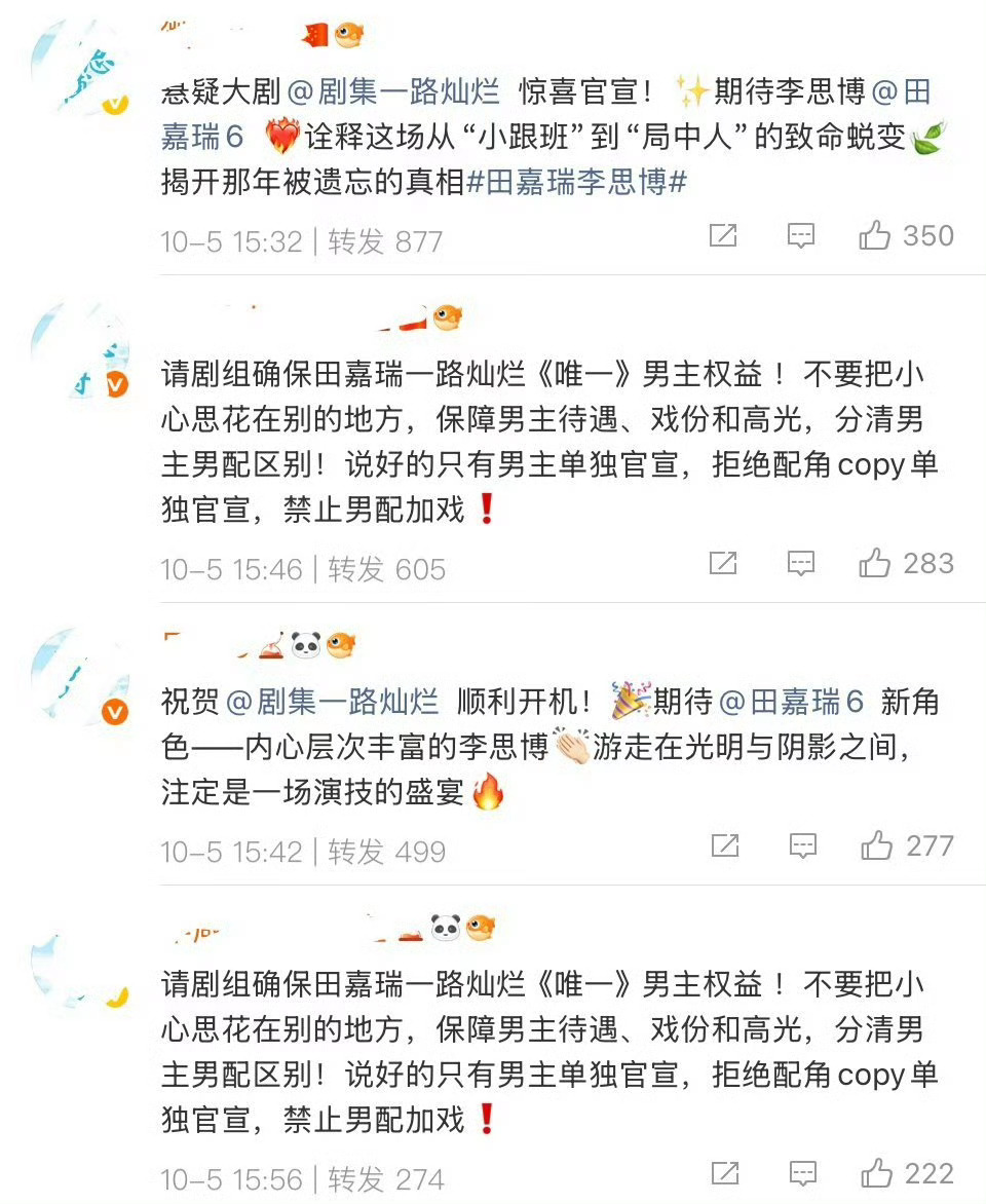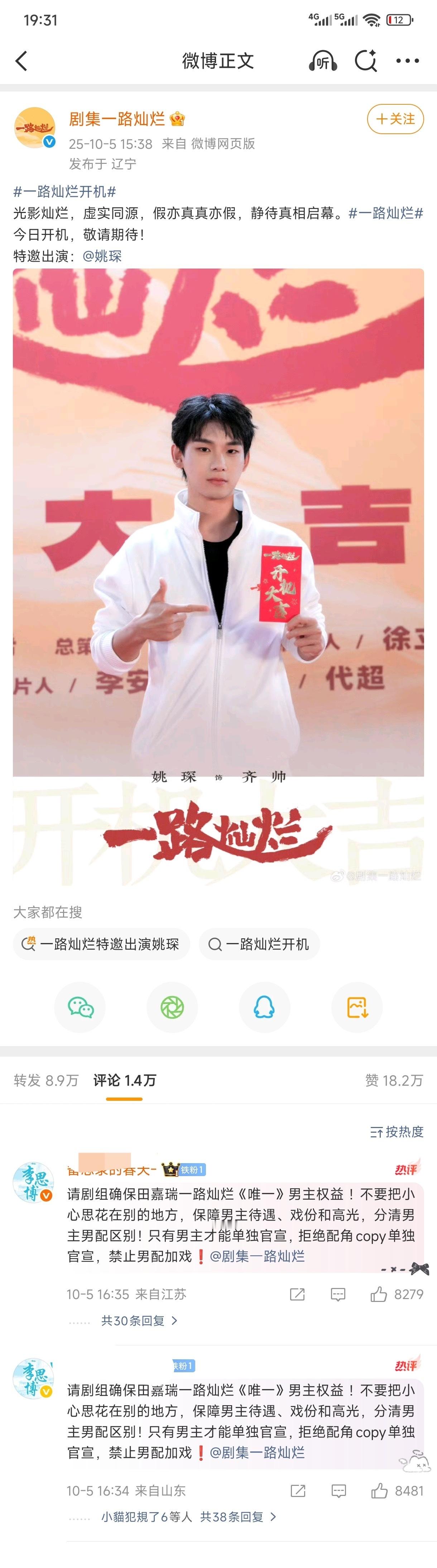 《一路灿烂》特主男一号田嘉瑞的粉丝屠了姚琛的官宣贴。