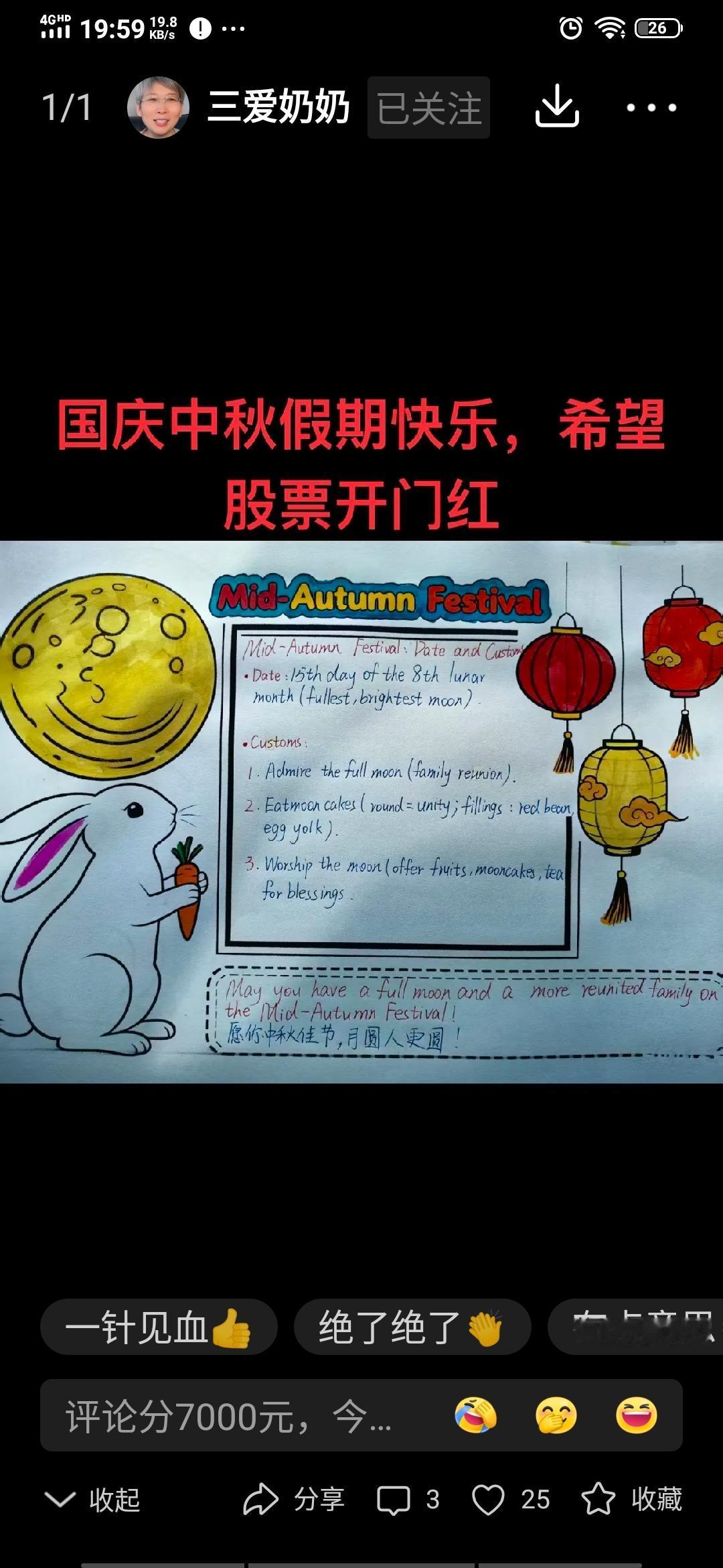 没了股票可关注的日子里,三爱奶奶晒出了这张图片。上面大多是英文,我看不懂。这会不会是远在国外的子女寄来的中秋贺卡呢?不过,里面的尊称用的是“你”而非“您”,许是在国外待久了,中文运用有些生疏。奶奶也没做说明,究竟如何,只能靠猜咯!