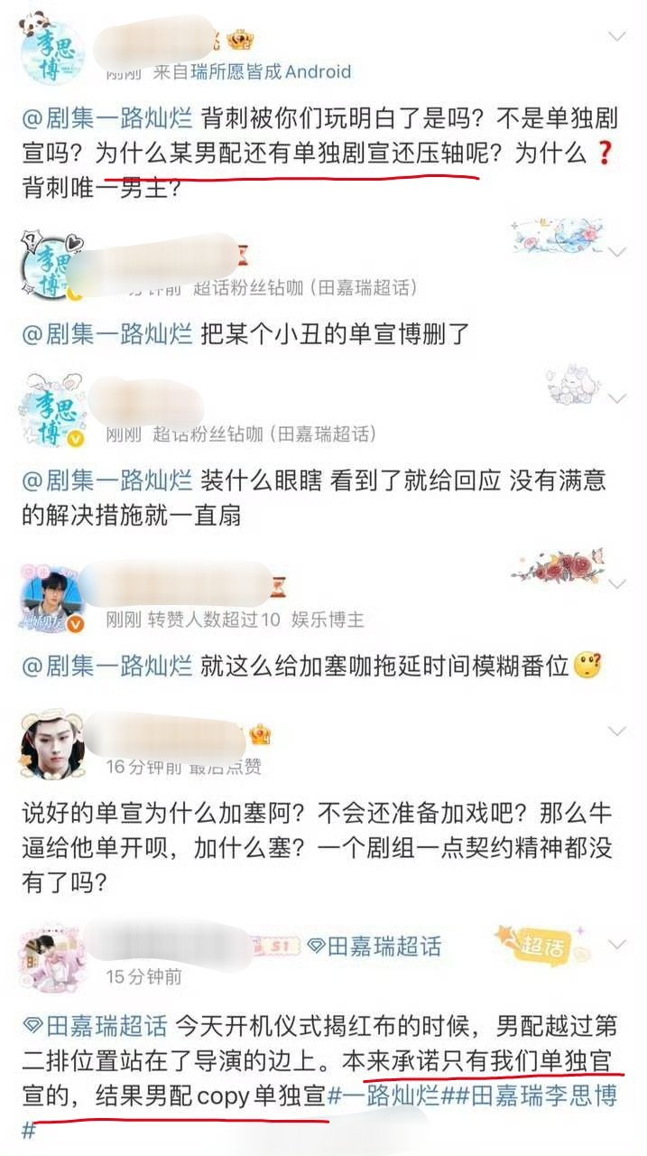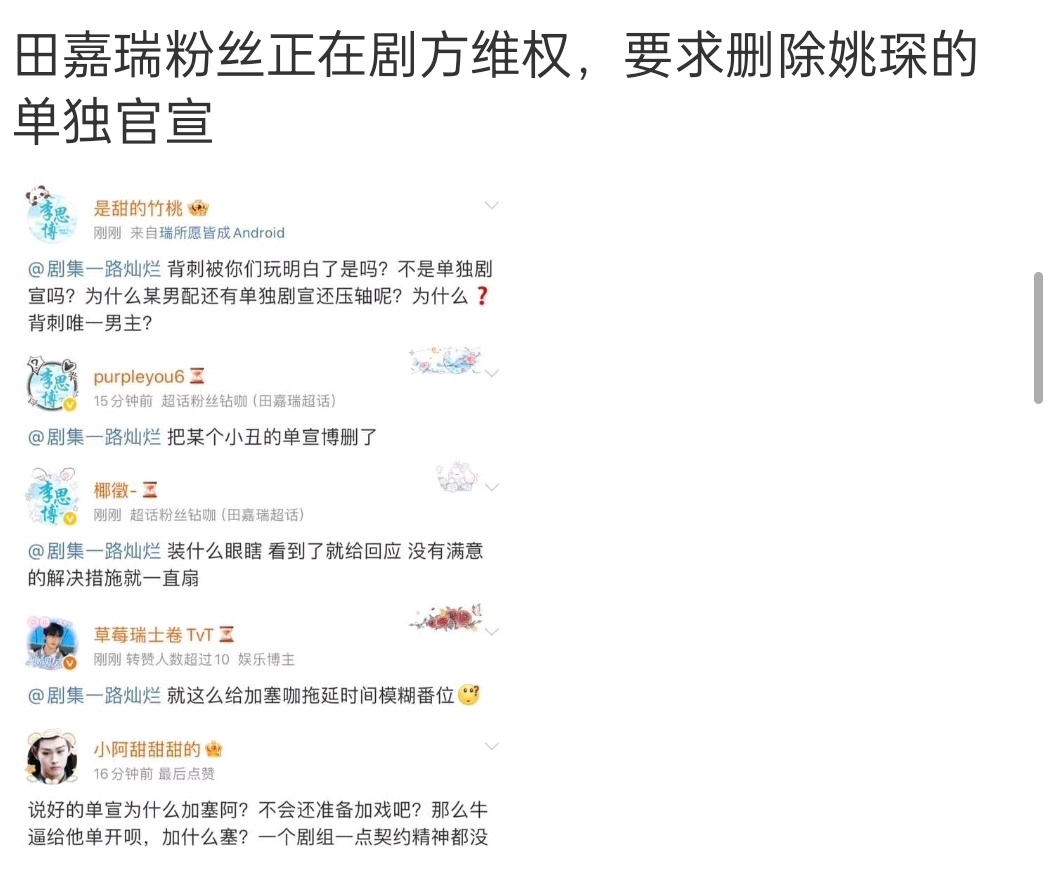 田嘉瑞粉丝维权,说剧方承诺了只让田嘉瑞单独官宣,现在姚琛居然也单独官宣了,还压轴了 ​​​