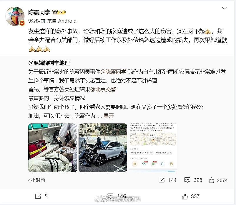陈震再发文道歉 发生车辆事故是我们不愿看到的,大家国庆出行也要注意安全[捂嘴哭]