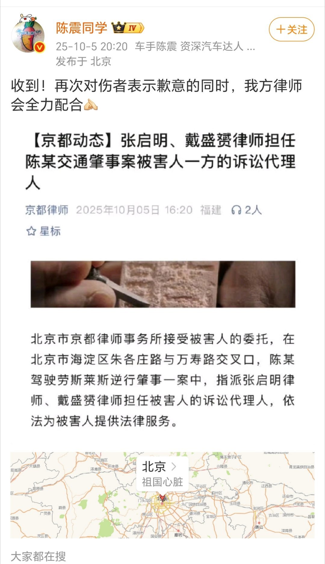 陈震回应伤者委托律师诉讼陈震这次事故,短时间不会平息,各方都在利用这次机会,赔付不会少。