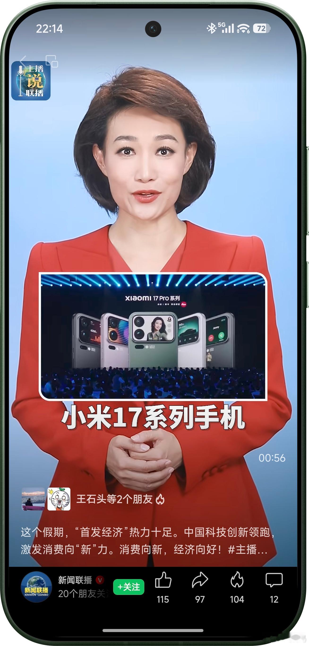 今天的央视《主播说联播:满满科技感!出片,出圈》小米17系列的“妙享背屏”创新排